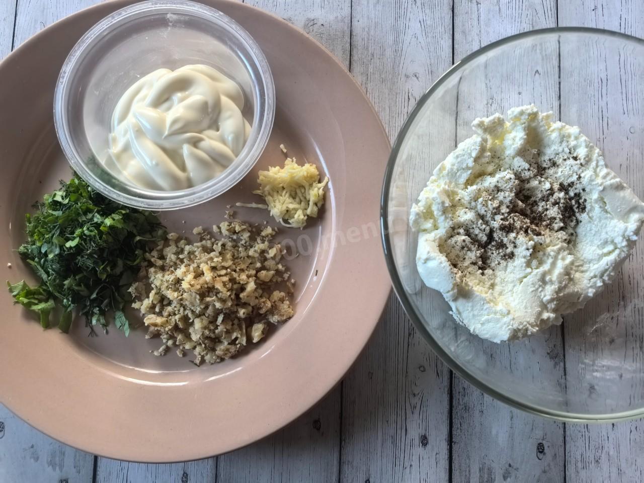 Для начала сделаем рулетики из баклажанов с ореховой начинкой. Измельчите грецкие орехи. Это можно сделать при помощи блендера, скалки, или мелко нарежьте ножом. Укроп и петрушку мелко нарежьте. 2 зубчика чеснока пропустите через пресс или натрите на мелкой терке. Смешайте творог с щепоткой черного молотого перца, остальными ингредиентами и 1 ложкой майонеза. Творог выбирайте качественный, натуральный, с выбором поможет статья в конце рецепта.