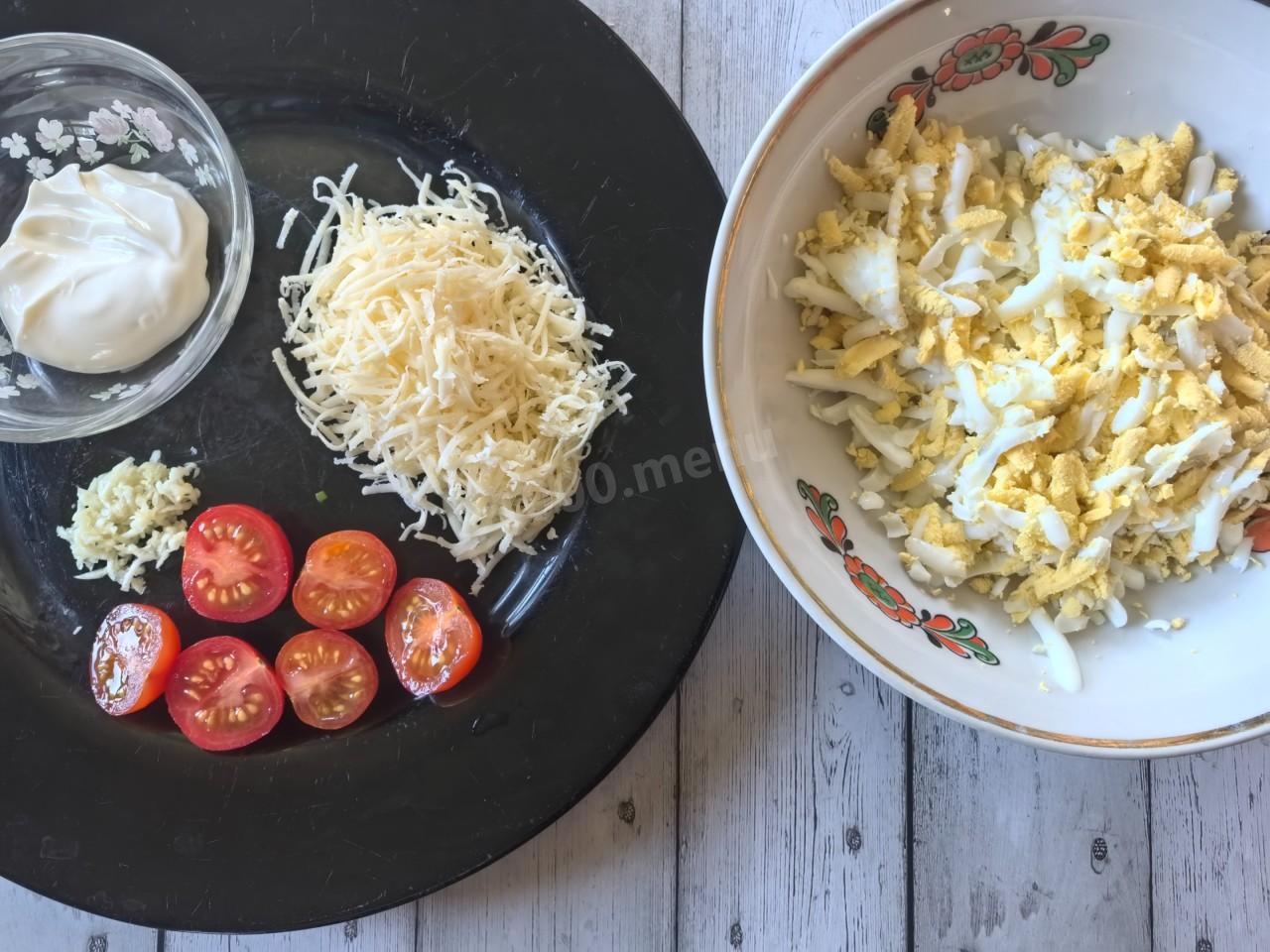 Приготовим вторую начинку. Сваренное заранее яйцо натрите на крупной терке. Томаты черри разрежьте пополам. Сыр натрите на мелкой терке, а 2 зубчика чеснока пропустите через пресс или натрите на мелкой тёрке. Смешайте все ингредиенты, добавив 1 ложку майонеза.