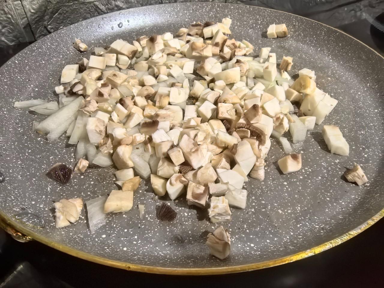 Для следующей начинки нам понадобятся лук и грибы. Нарежьте их мелким кубиком и обжарьте до золотистого цвета. Посолите по вкусу.