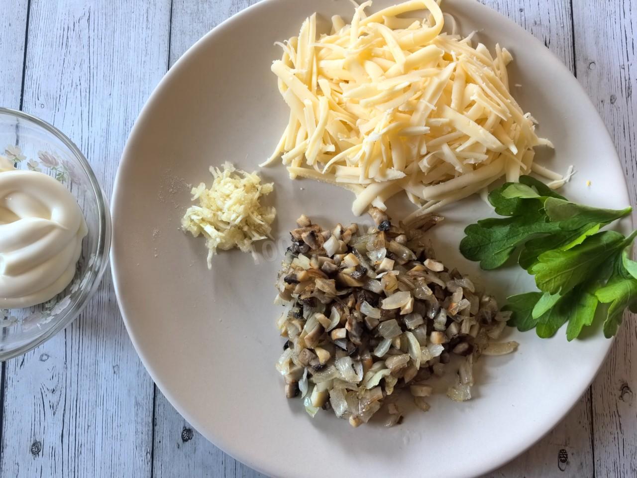 Грибы с луком готовы. Далее натрите сыр на крупной терке, 2 зубчика чеснока натрите или пропустите через пресс. Петрушку мелко нарежьте. Смешайте все ингредиенты, добавив столовую ложку майонеза.