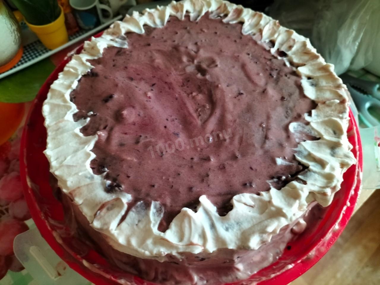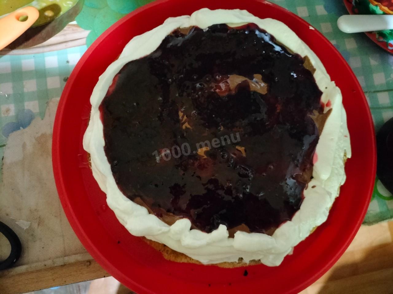 Сверху положите второй корж, пропитайте его, смажьте кремом и сделайте борт. Теперь поверх крема сначала выложите варенье, а на него какао-глазурь, аккуратно разровняйте. Поставьте торт в холодильник минимум на 5 часов, лучше на ночь.