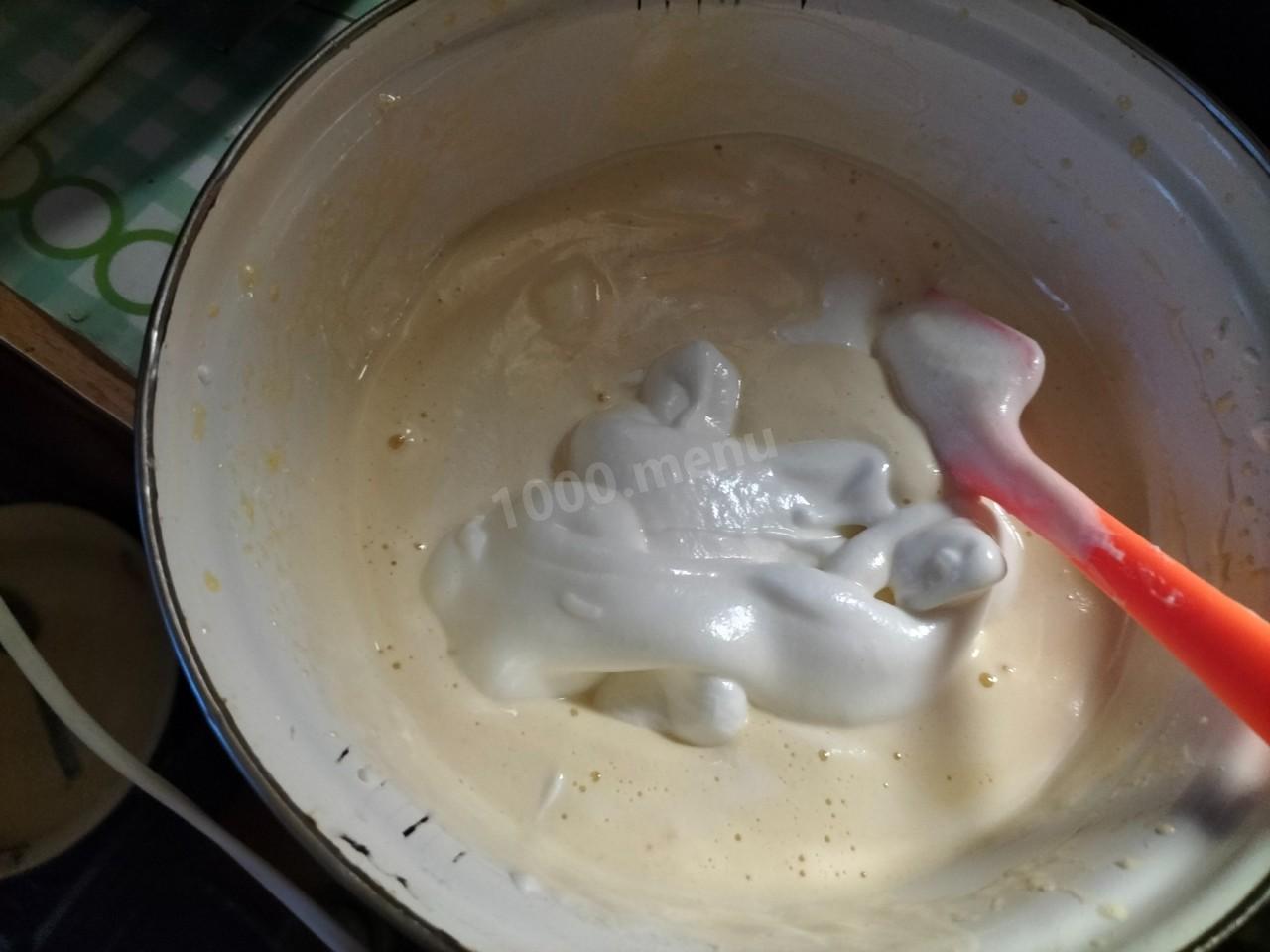 В желтковую массу маленькими порциями добавляйте взбитый белок и очень аккуратно вмешиваете.