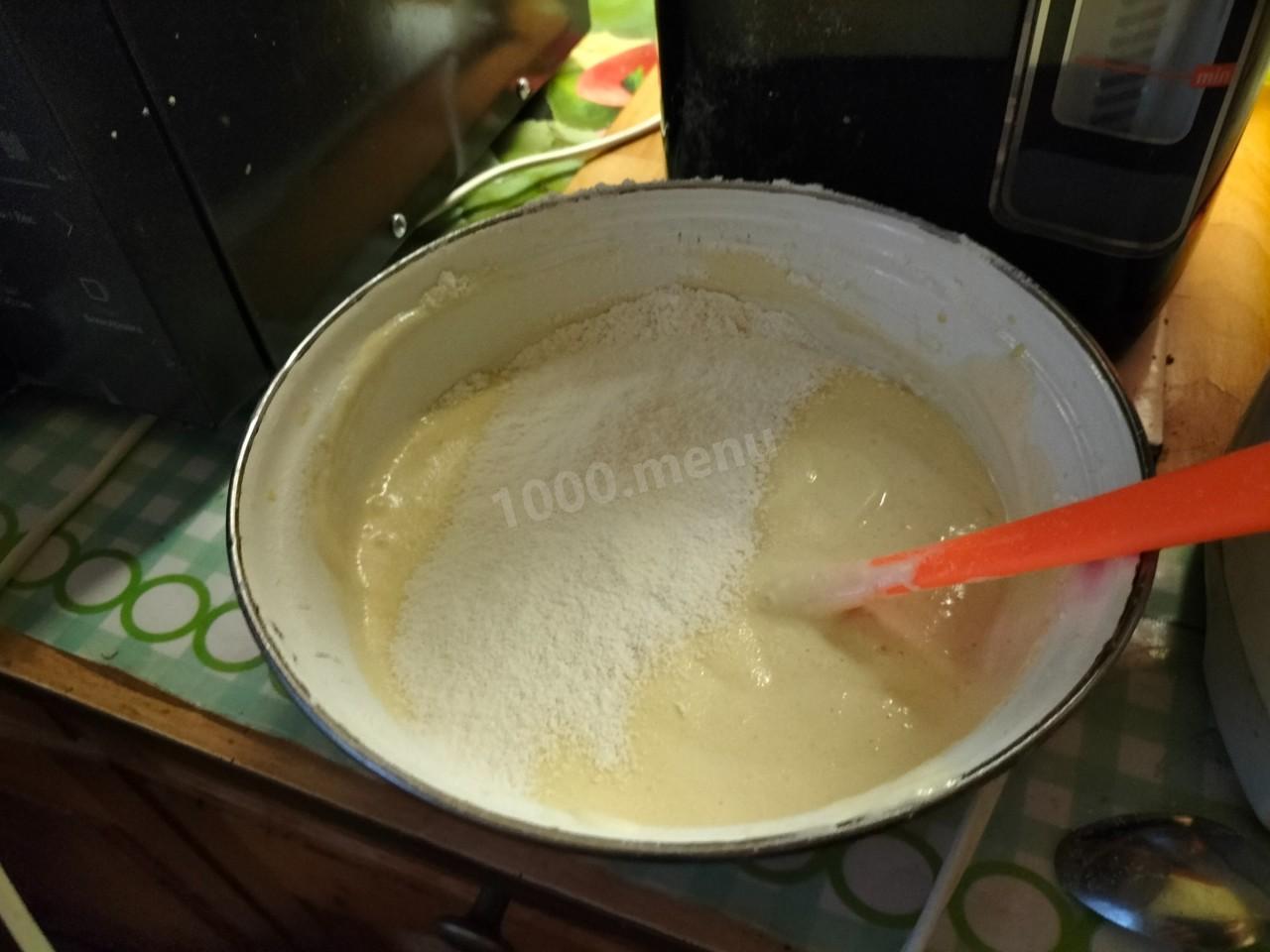 В яичную массу небольшими порциями просейте муку, чтобы она насытилась кислородом, аккуратно перемешайте. Добавьте разрыхлитель и кукурузный крахмал, аккуратно перемешайте.