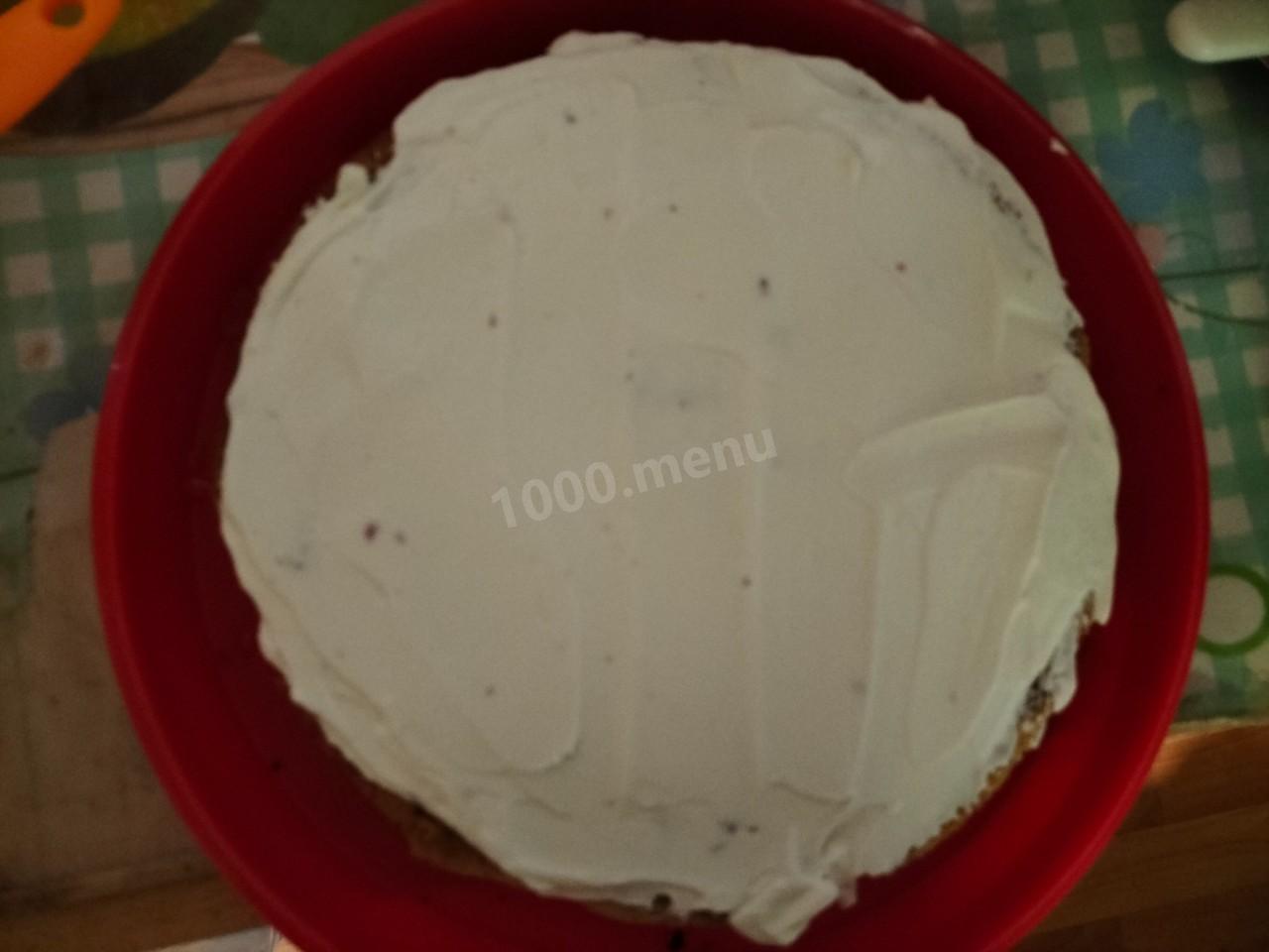 Хорошо пропитайте бисквит. После выложите на него часть крема и разровняйте.