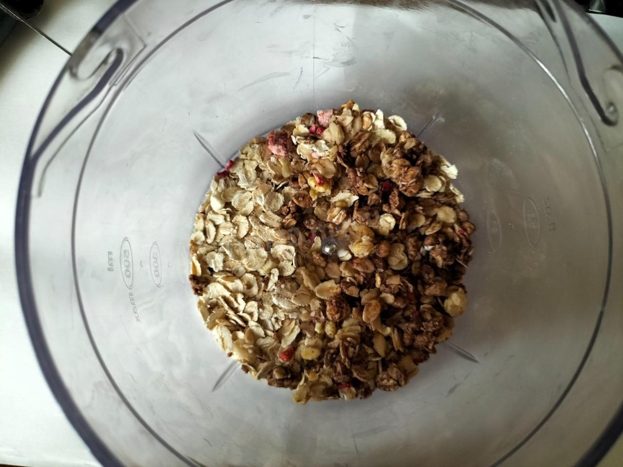 Высыпьте овсяные хлопья и льняные семечки в блендер.