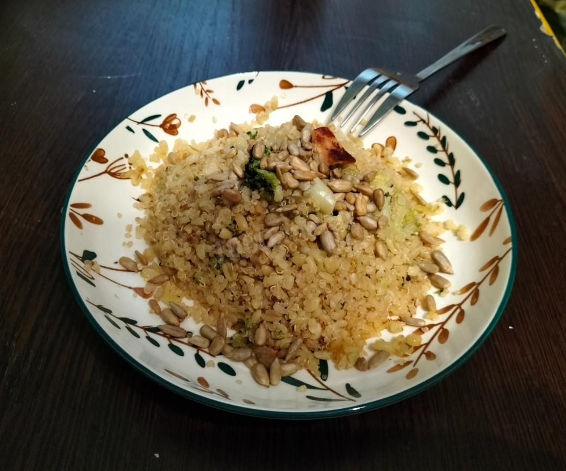 Булгус с киноа, индейкой, брокколи и семенами подсолнуха