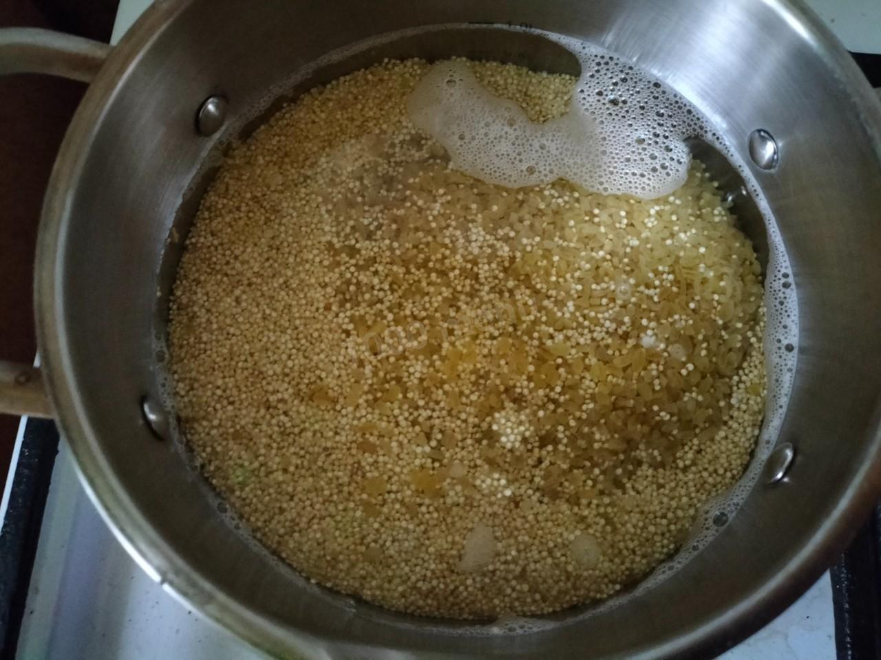 Вскипятите воду. Высыпьте в неё булгур и киноа, варите 10 минут.