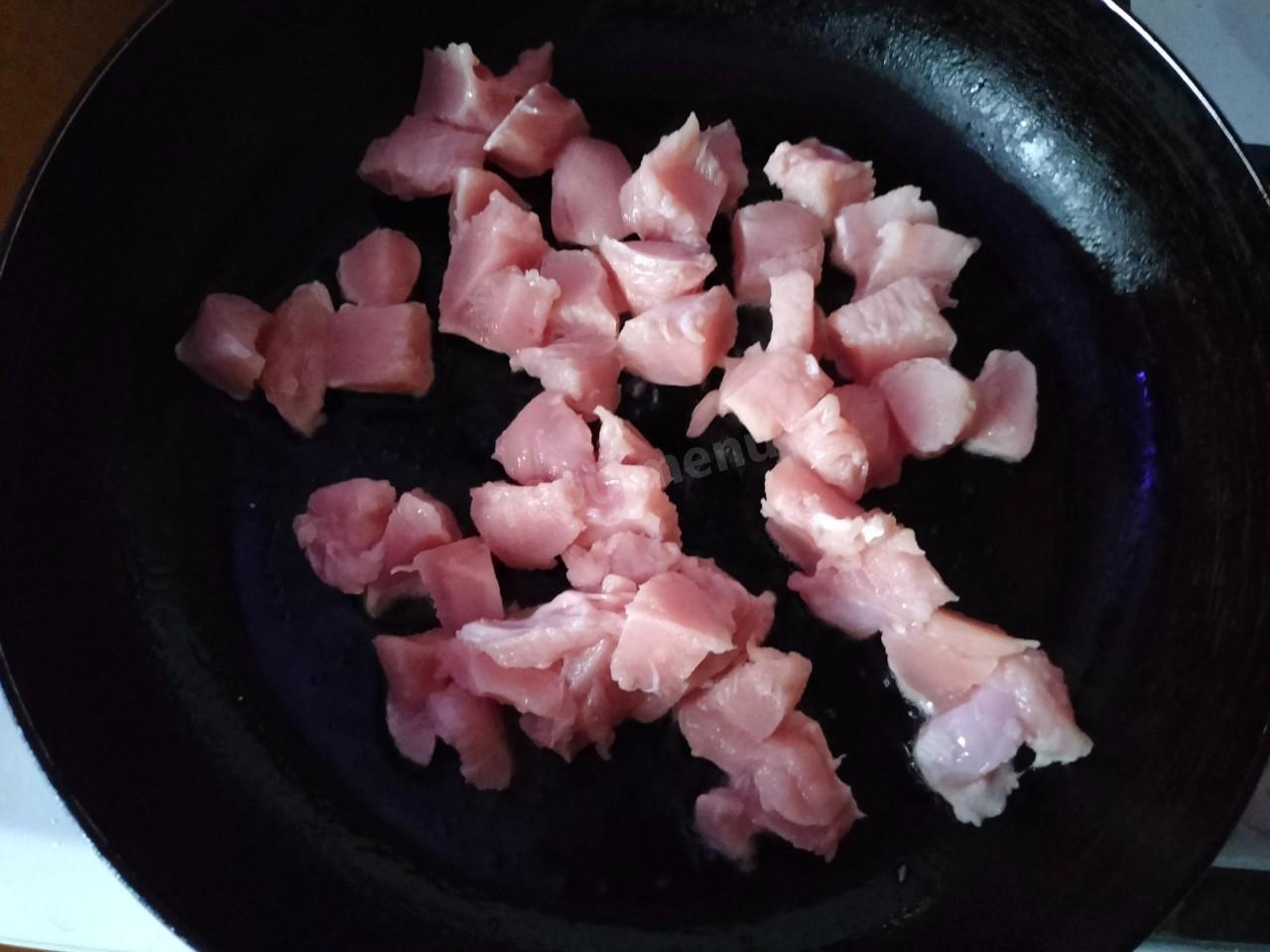 Сковороду разогрейте с маслом. Положите на неё нарезанную индейку и обжаривайте 10 минут.