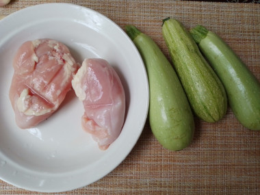 Разморозила куриное филе. Так как кабачки у меня были не сильно крупные нарезала их полукружьями. Филе нарезала кубиком.