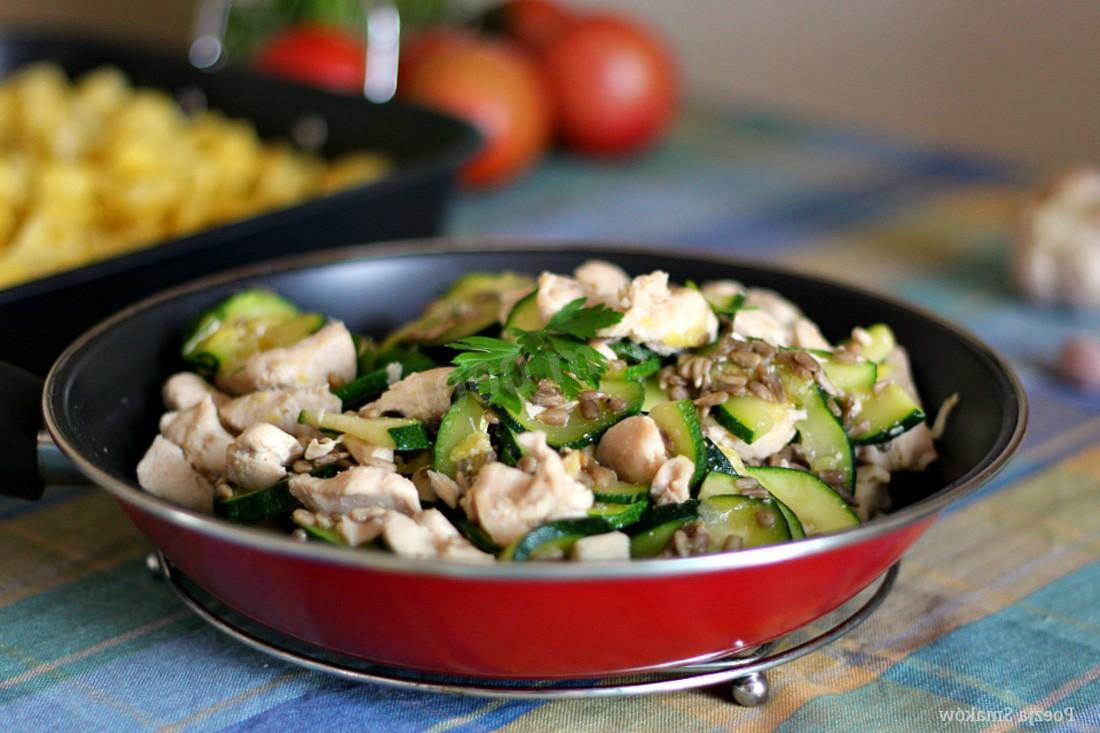 Курицу обжарила до готовности, у нее была легкая золотистая корочка. Добавила кабачки и подержала еще минут 5 на огне. Семечки решила не добавлять, возможно в следующий раз.