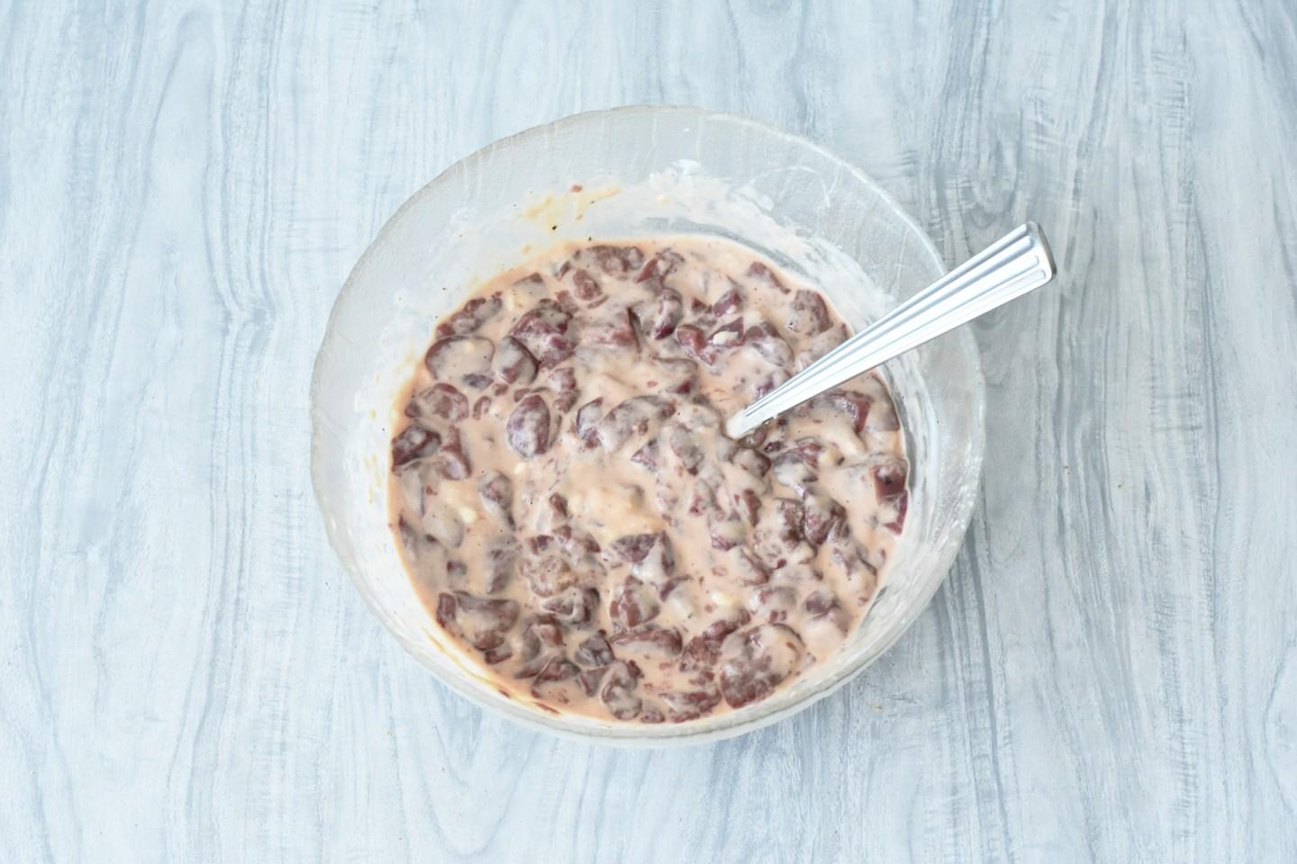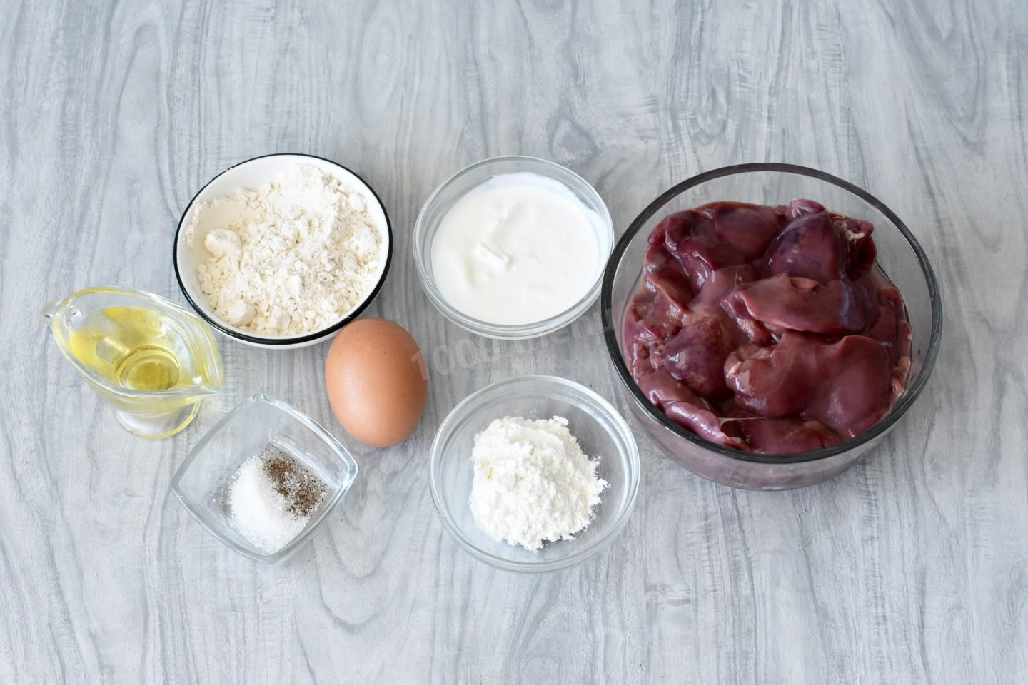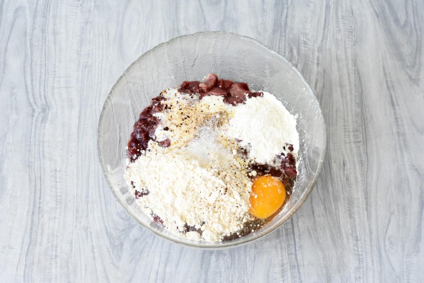 В миске соедините куриную печень, яйцо, сметану, муку, крахмал, соль и перец. Можете добавить свои специи по вкусу.