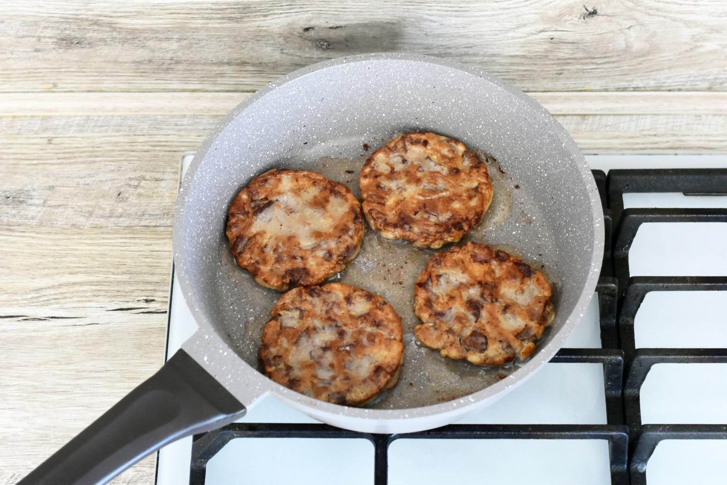 В сковороде на среднем огне разогрейте растительное масло. Ложкой выложите немного печеночной массы и придайте ей форму котлет. Сколько жарить котлеты из печени? Обжарьте по 2-3 минуты с двух сторон до румяной корочки. Сильно зажаривать котлеты не нужно, иначе печенка станет жесткой. Проверьте печень на готовность: она должна выделять прозрачный сок без примесей крови. Как выбрать сковороду и масло для жарки читайте в статьях по ссылкам в конце рецепта.