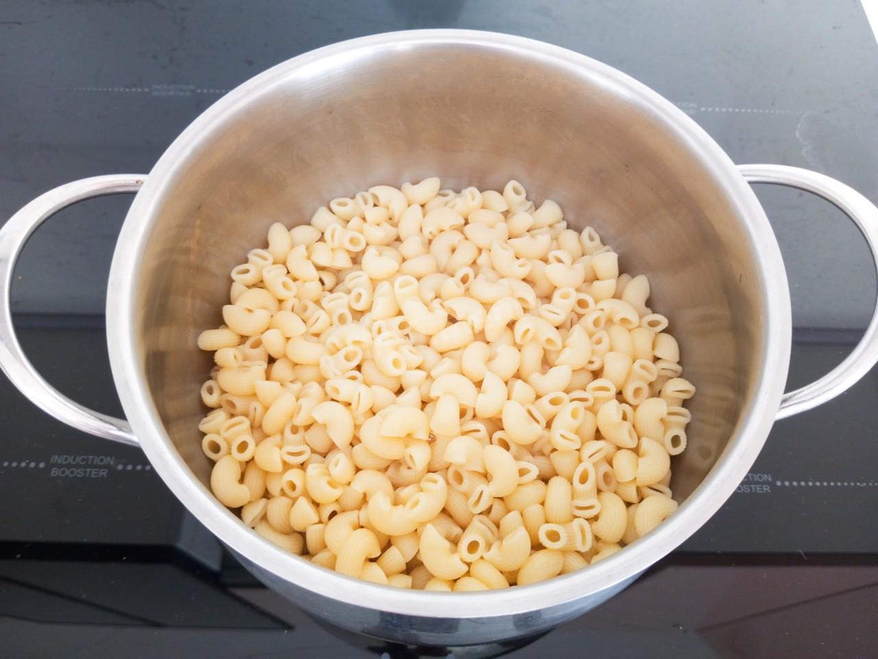 В кастрюлю налейте воду из расчёта 1:10. На 250 граммов макарон необходимо не меньше 2,5 литров воды. Всыпьте макароны в кипящую воду и варите в подсоленной воде почти до готовности примерно 5 минут. Время варки зависит от сорта макарон. Нужно ориентироваться на рекомендации производителя, уменьшив время варки на 2-3 минуты. Воду с готовых макарон слейте. Промывать макароны не надо.