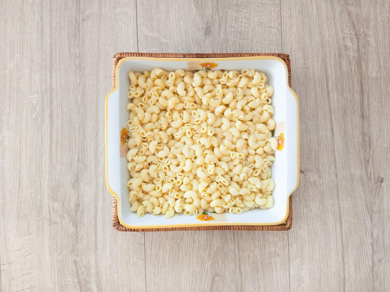 В жаропрочную форму для запекания выложите макароны и залейте их молочно-яичной смесью. С выбором формы для запекания поможет статья по ссылке в конце рецепта.