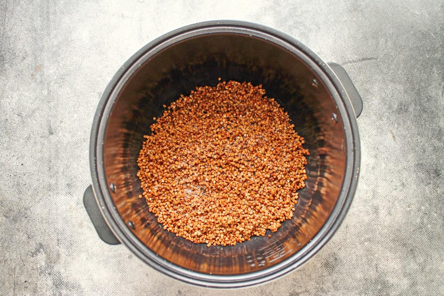 Гречку переберите, ведь в ней могут попадаться пустые зернышки, оболочка, веточки и даже мелкие камушки. Если греча у вас светлая, ее можно предварительно обжарить. Для этого сухую гречку насыпьте тонким слоем на разогретую на среднем огне сковороду с толстым дном. Мешая, обжаривайте крупу в течение 3-5 минут до легкого потрескивания и ароматом жареных орехов.