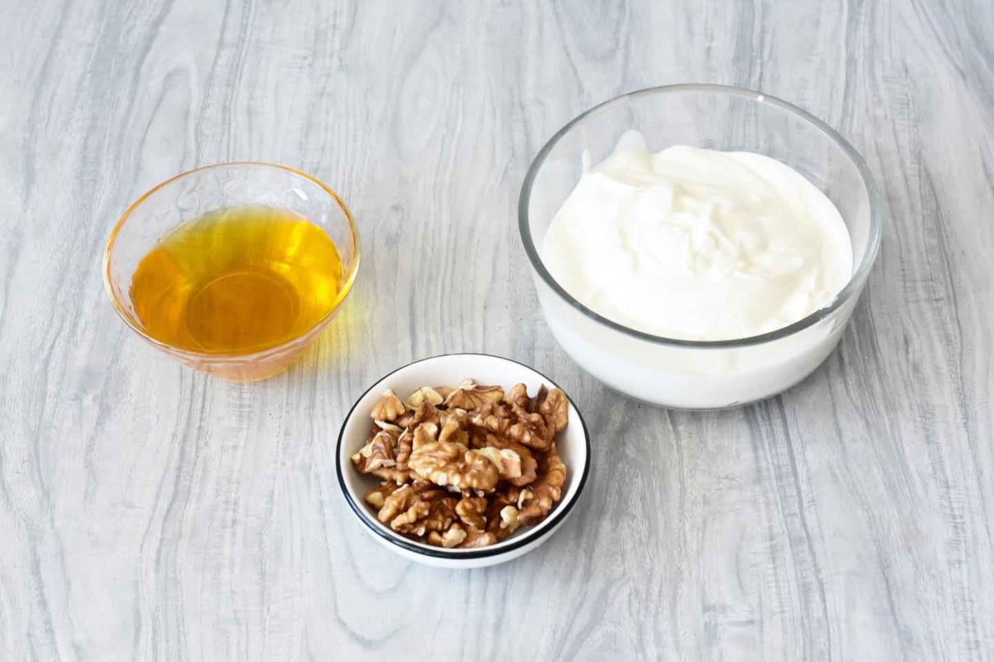 Как сделать быстрый ПП десерт из греческого йогурта меда и орехов? Очень просто и быстро. Для начала подготовьте необходимые ингредиенты по списку. Греческий йогурт можете заменить любым натуральным йогуртом без добавок. Мед берите с насыщенным цветом и ароматом. От вида и качества меда зависит итоговый вкус десерта. С цветочным он будет слаще, с каштановым - с легкой горчинкой.
