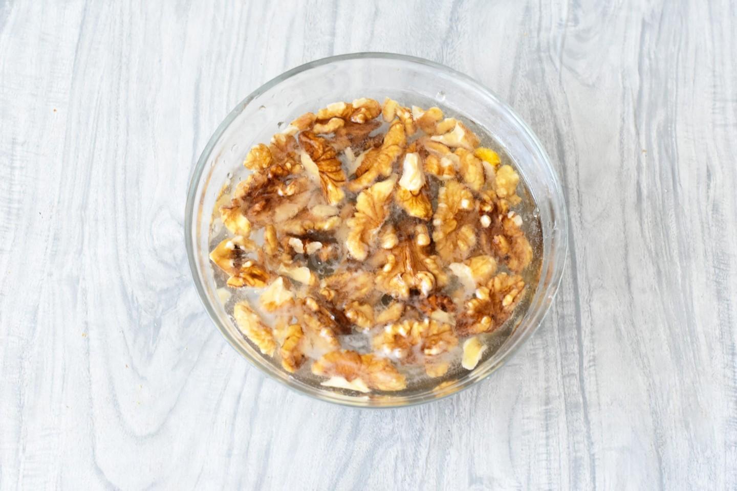 Грецкие орехи тщательно промойте. Обязательно нужно промывать орехи, которые продаются на развес. Вода от них часто совсем черная.