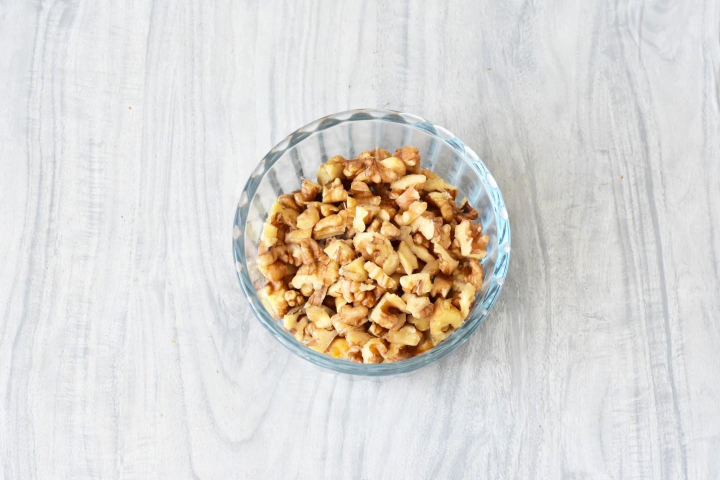 Грецкие орехи порубите ножом или поломайте руками на небольшие кусочки. Грецкие орехи можете заменить на фундук, пекан или другие орехи по вкусу.