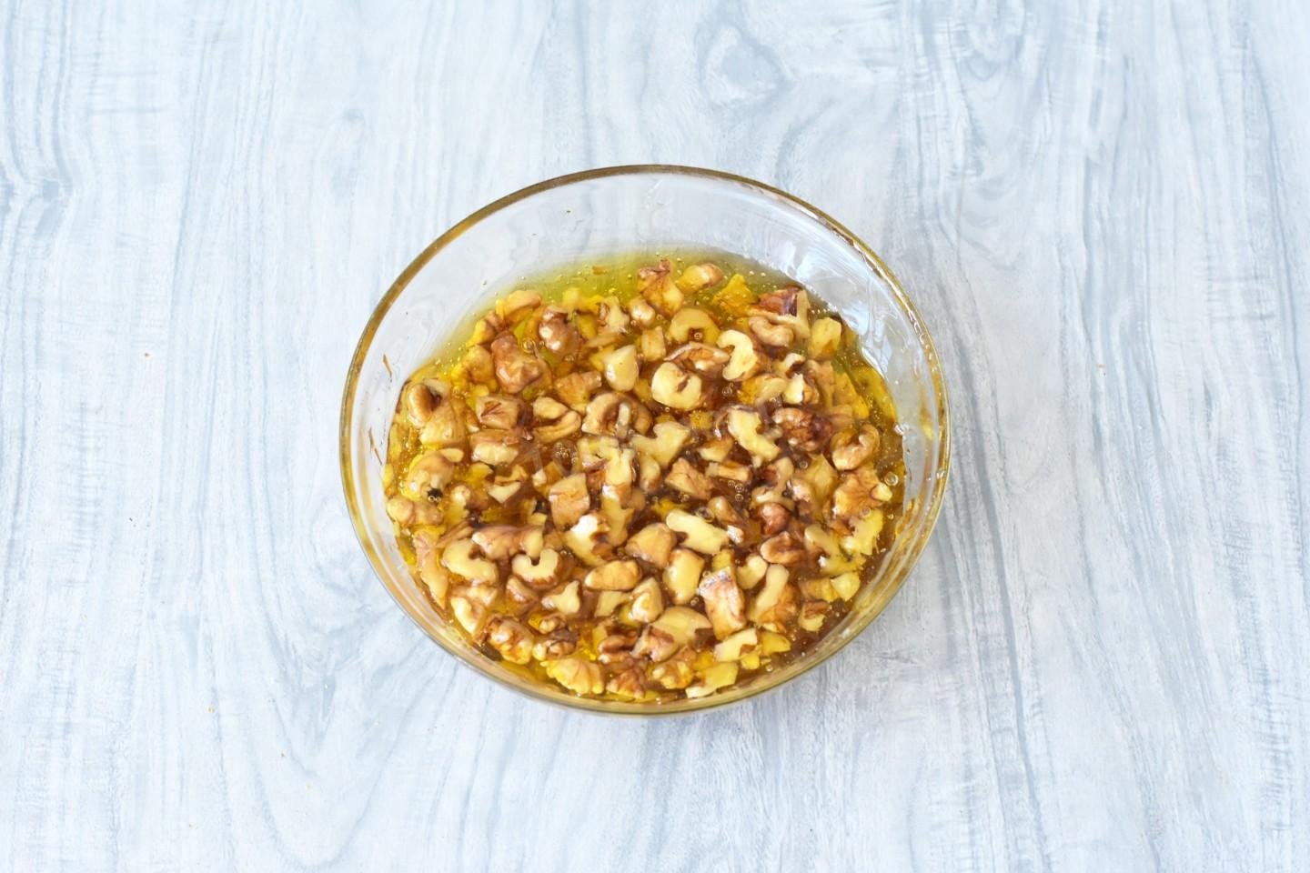 В мисочке соедините жидкий мед и грецкие орехи и перемешайте.