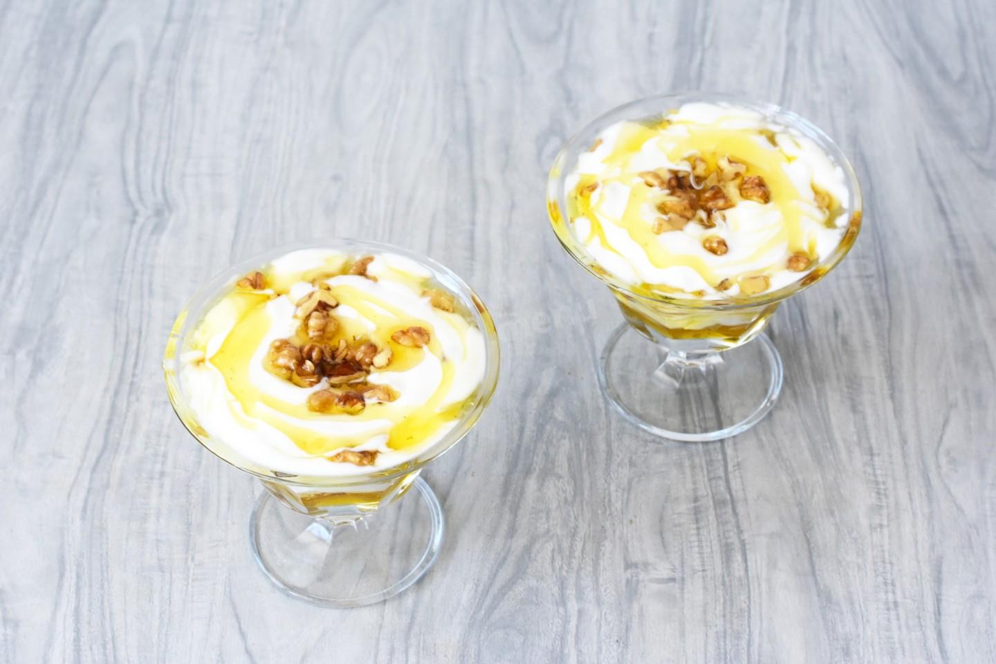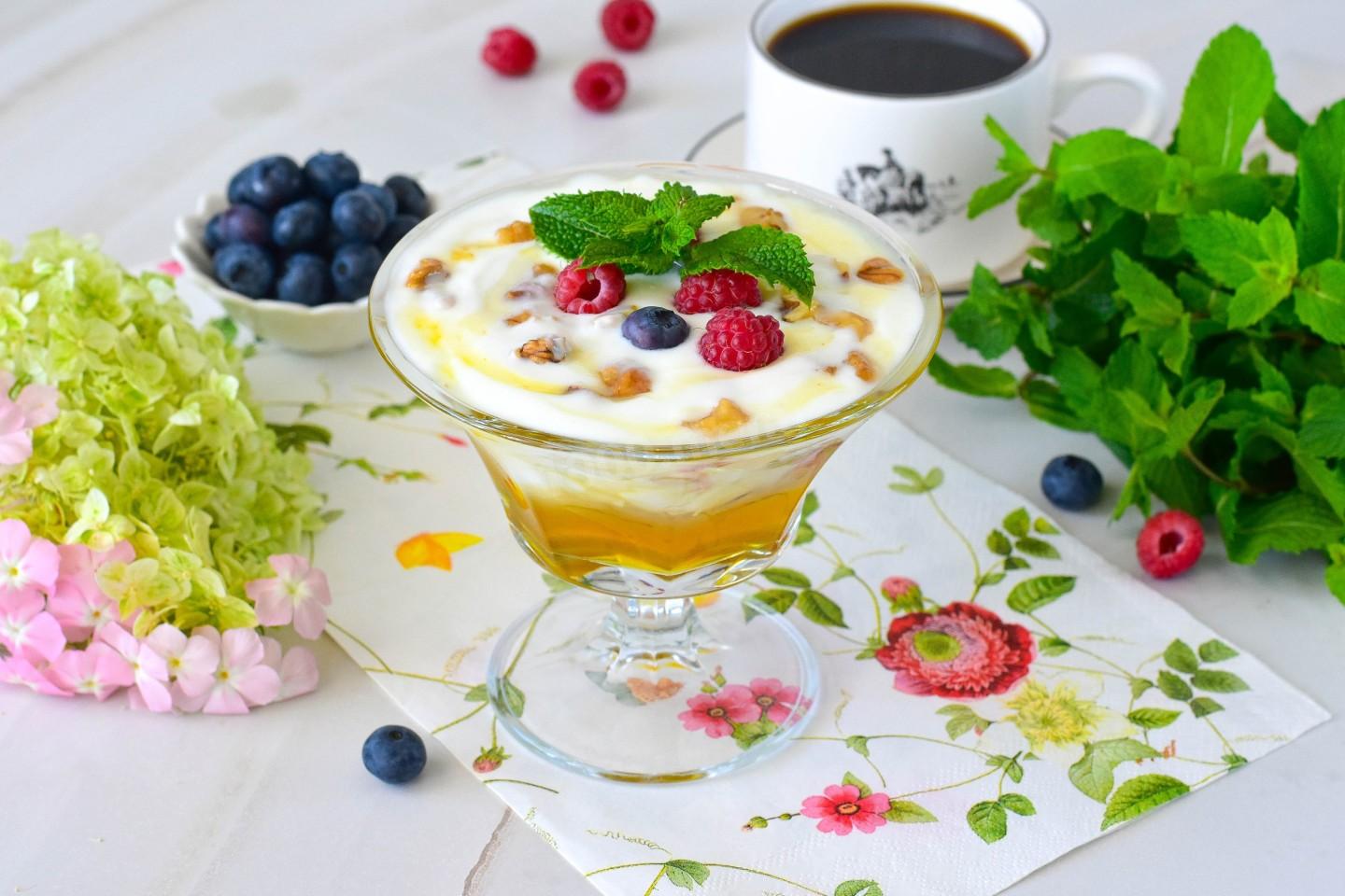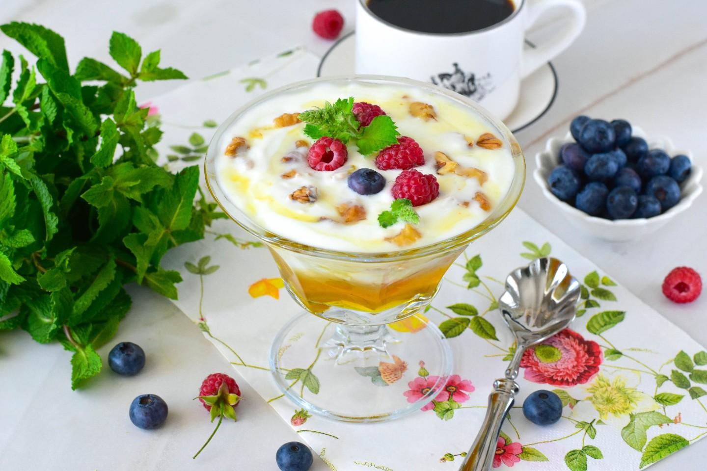 Этот десерт — идеальный вариант для тех, кто любит сладкое, но следит за питанием. Греческий йогурт богат белком, мёд заменяет сахар, а орехи добавляют хруст и полезные жиры.