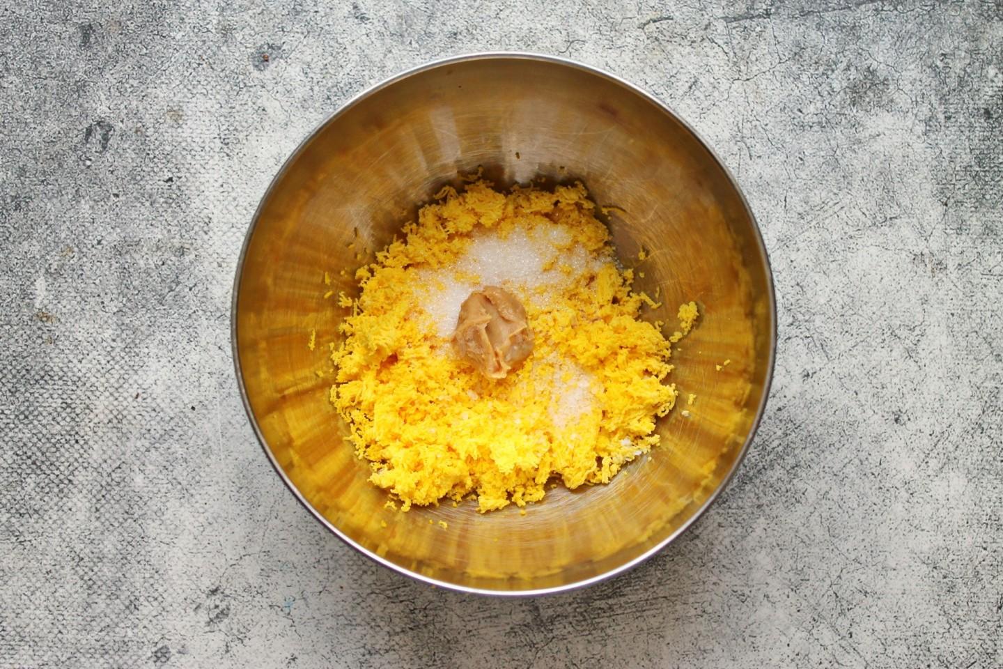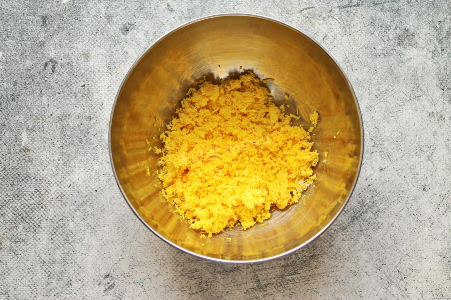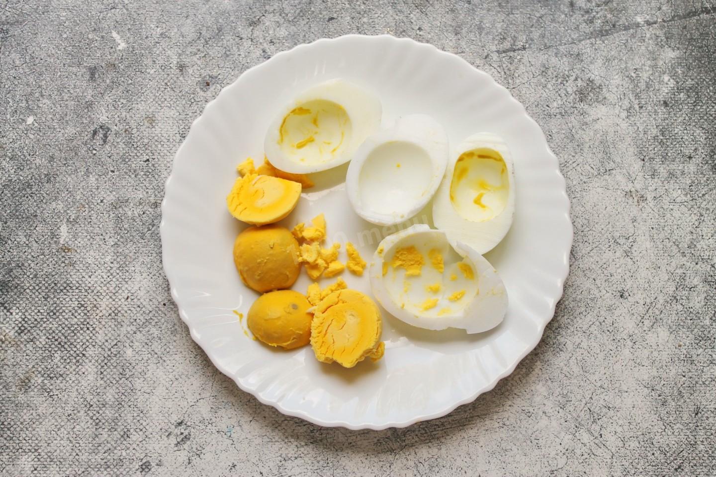 Яйца вымойте в теплой воде, ведь даже при видимой чистоте на них может остаться грязь и микробы, а при варке они иногда лопаются. Яйца положите в кастрюлю с холодной водой и поставьте на средний огонь, доведите до кипения. Варите яйца вкрутую в течение 12-15 минут, время зависит от размера яиц. Полезные советы по приготовлению и выбору яиц можно найти в статье под шагами ниже. Готовые яйца остудите, почистите и разделите на белки и желтки.