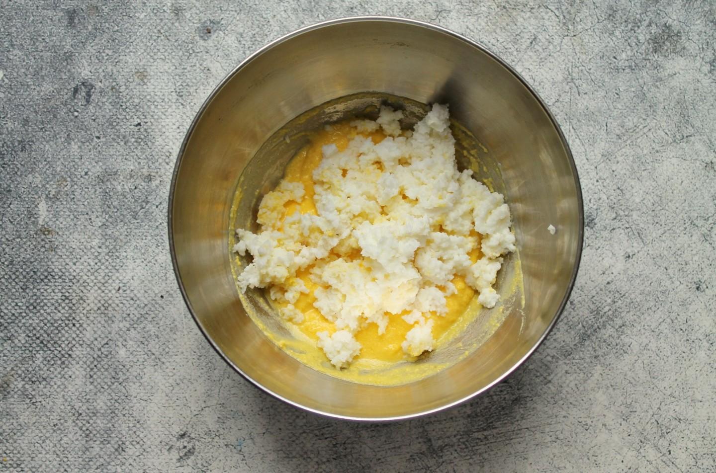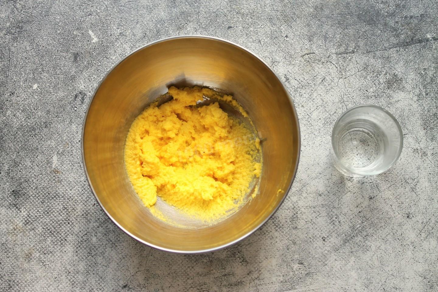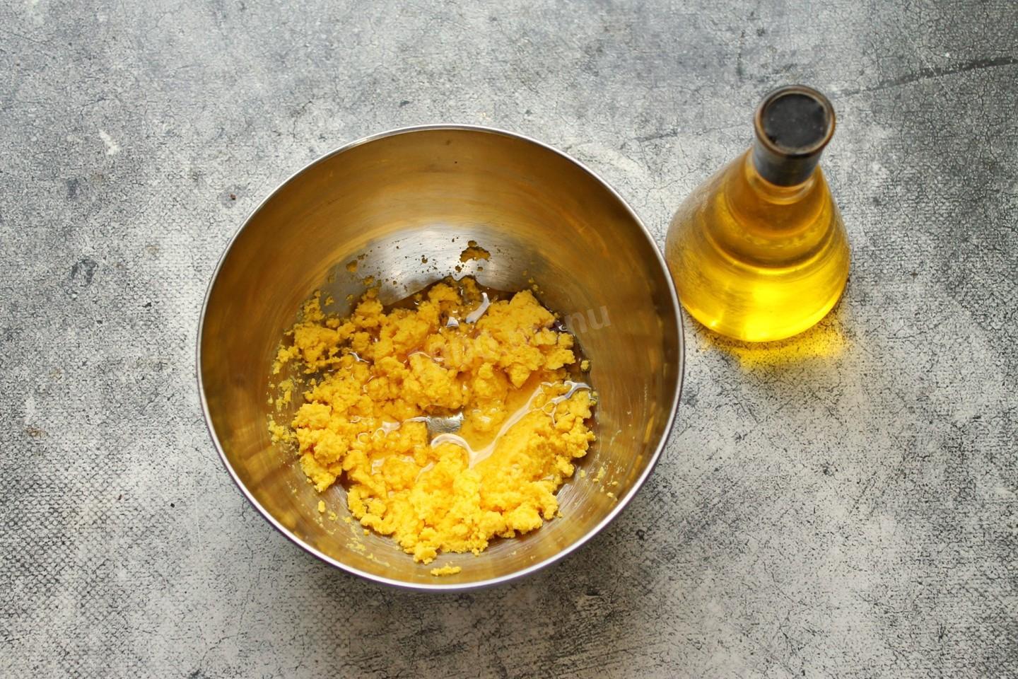 Добавьте в желтковую массу уксус и хорошо перемешайте. Вместо уксуса можно взять лимонный сок или уксус из красного вина.