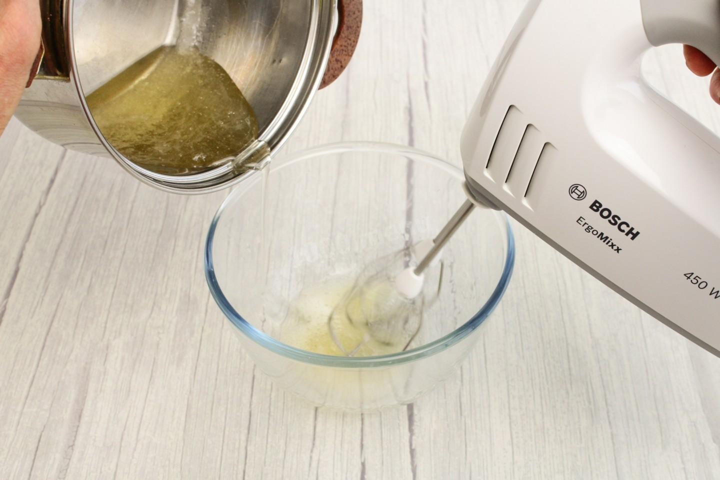 Не прекращая взбивания, влейте тонкой струйкой сироп. Вливайте сироп по краю чаши, чтобы он не попал на венчики миксера.