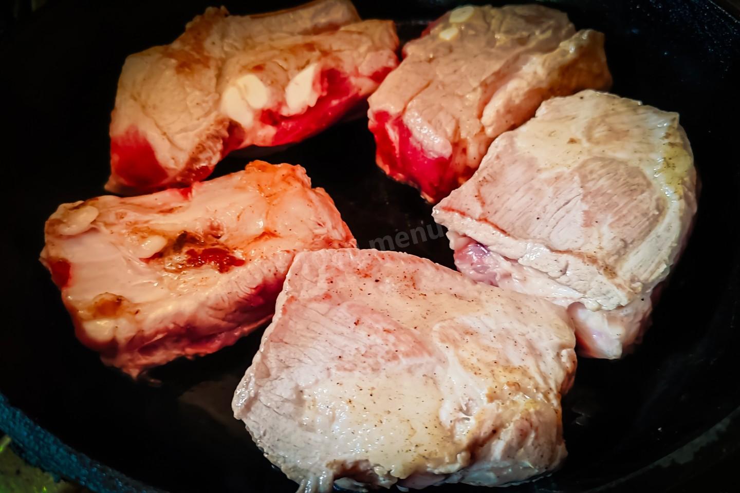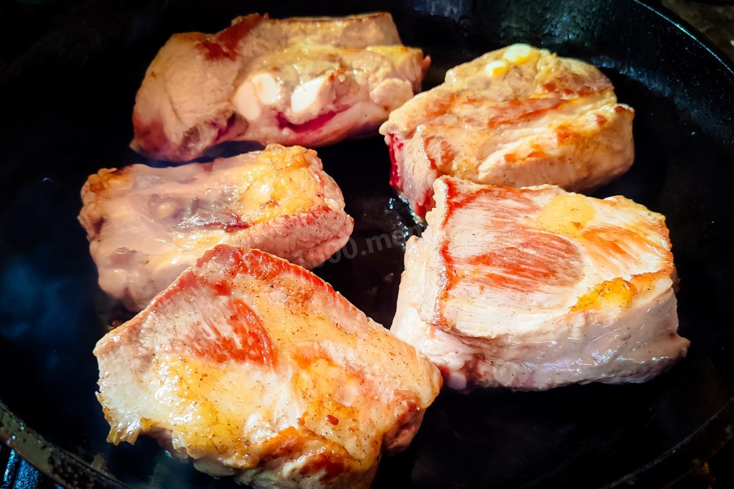 Сковороду хорошо на сильном огне прогреть (я пользуюсь только чугунными сковородами!), и без масла обжарить каждый кусочек мяса с двух сторон до золотистой корочки. Когда будет обжариваться первая сторона, то не надо стараться оторвать мясо от сковороды. Когда мясо поджарится, то оно само отстанет от сковороды.