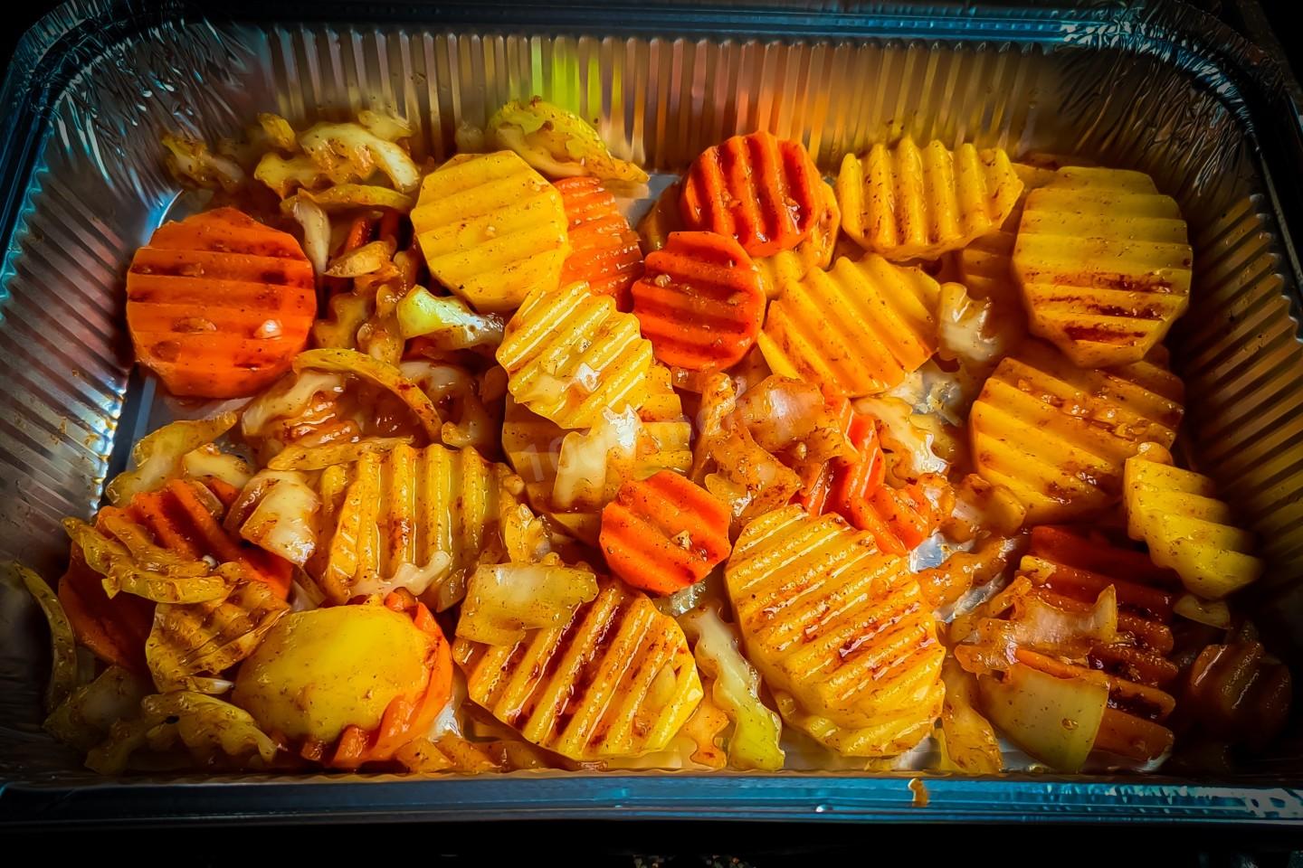 Пока маринуется мясо, приготовим овощи. Нарезать фигурным ножом картошку, морковь и лук. Переложить в отдельную глубокую посуду. Добавить к овощам соль, паприку, масло (маринад 2). 3 зубчика чеснока раздавить на доске ножом и затем измельчить. Измельчённый чеснок всыпать в овощи. Овощи хорошо перемешать и тоже оставить мариноваться.