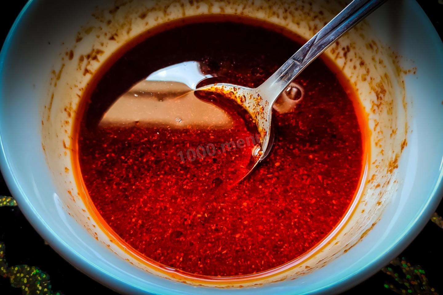 Пока всё маринуется, приготовим глазурь. Для этого в чашку влить мёд, уксус, сладкий соус чили, соевый соус, всыпать сухой чеснок, влить масло и добавить паприку. Хорошо всё перемешать.
