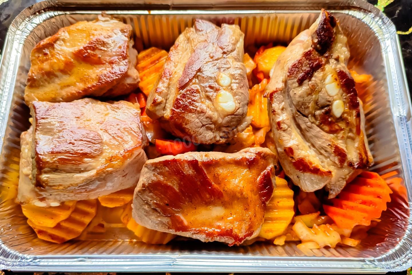 Наши маринованные овощи переложить в глубокую посуду для запекания (я использовал одноразовые алюминиевые формы), распределить по всей поверхности. Сверху выложить обжаренные кусочки мяса.