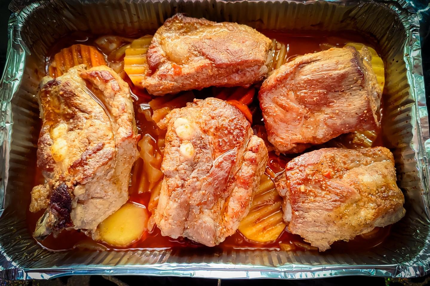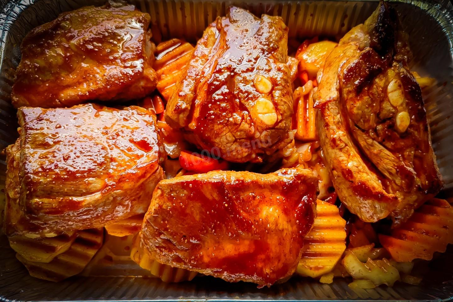Через 50-60 минут достать форму из духовки, снять фольгу и бумагу. Мясо (рёбрышки) выделять много сока, который пропитает собой наши овощи. Овощи получаются хорошо пропечёнными, мягкими и душистыми. Мясо нежное, мягкое и отходить от косточек.