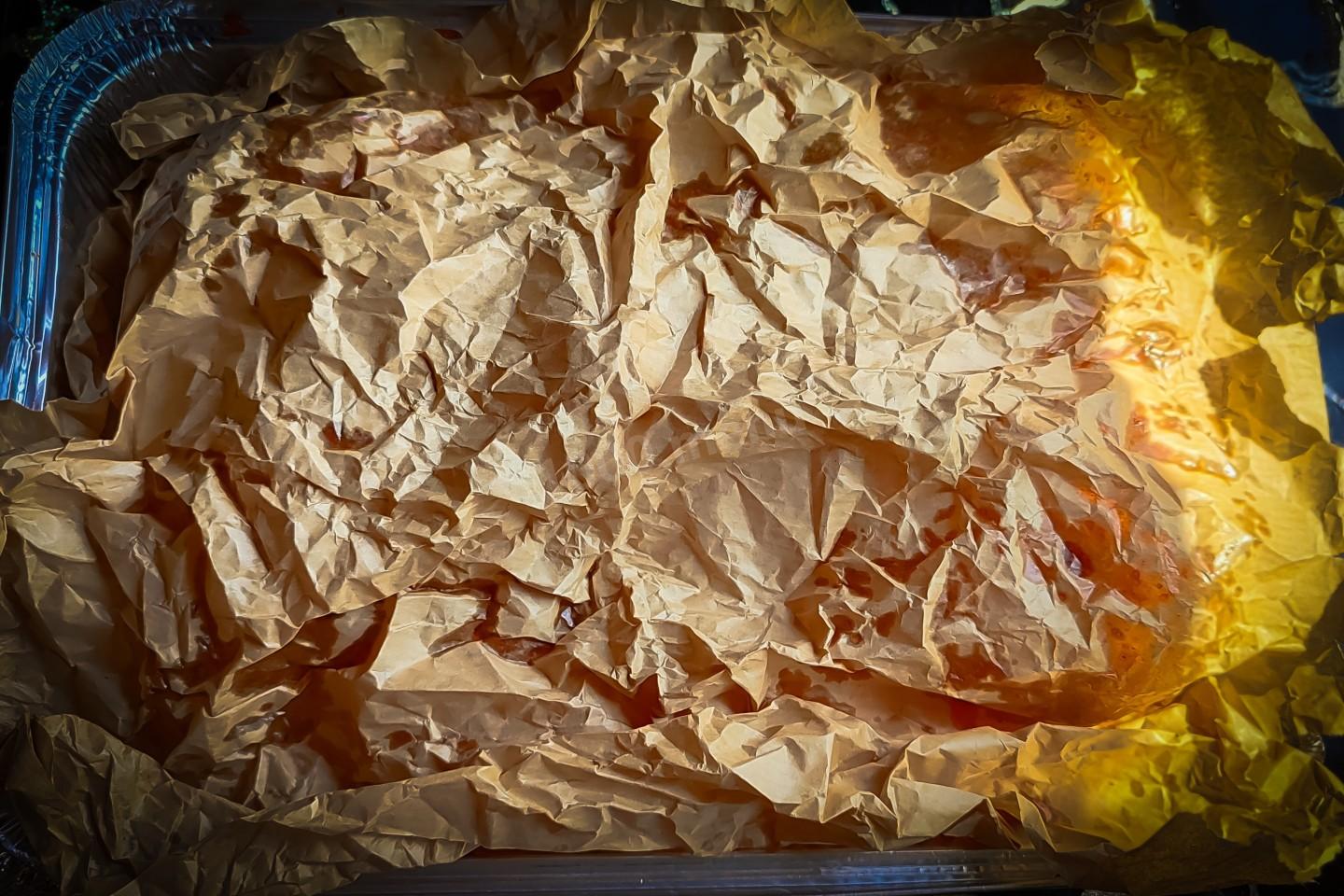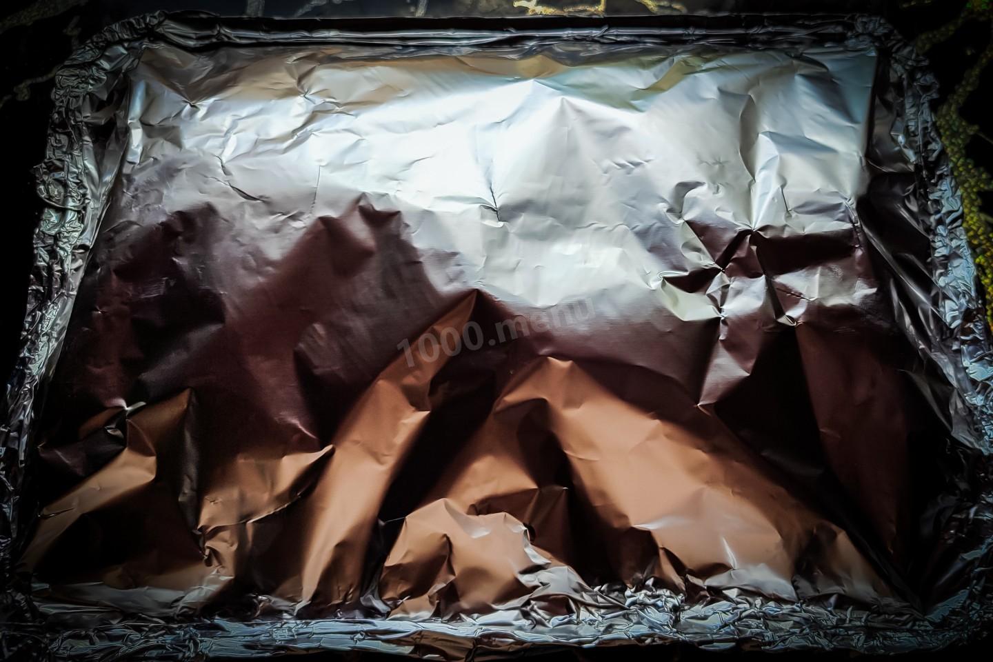 А теперь поверх бумаги накрыть алюминиевой фольгой и хорошо запечатать по краям. Форму поместить в предварительно прогретую духовку до +190℃ на 50-60 минут.