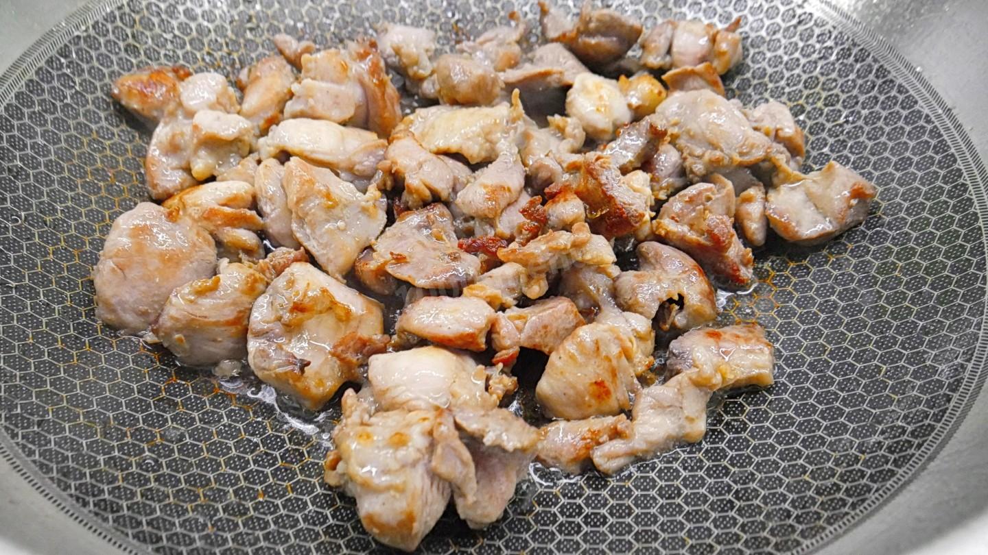 Сковороду разогреть на максимальном огне, влить остатки растительного масла, равномерно распределить его по стенкам. Обсушить ранее засоленную индейку бумажными полотенцами. Распределить индейку по сковороде одним слоем. Не трогать ее минуту: нужно получить зажаристую корочку с нижней стороны. Перевернуть индейку сырой стороной вниз и оставьте еще на минуту. Когда мясо получило коричневый оттенок, перемешивать его, не уменьшая нагрев, еще минуту.