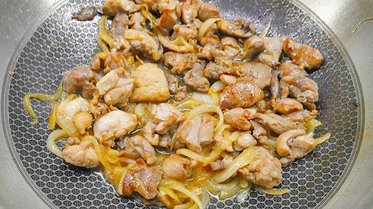 Филе бедра индейки нарезать небольшими порционными кусочками (на один укус), слегка посолить, хорошо перемешать, отставить в сторону на 10 минут. Пока индейка засаливается, нарезать лук тонкими перьями. Разогреть толстостенную сковороду на среднем огне, добавить 30 мл растительного масла, отправить лук. Часто помешивая, довести лук до прозрачности и начала карамелизации по краям (лук местами приобретет золотистый цвет), убрать сковороду с луком в сторону.