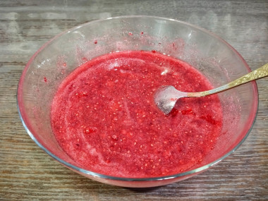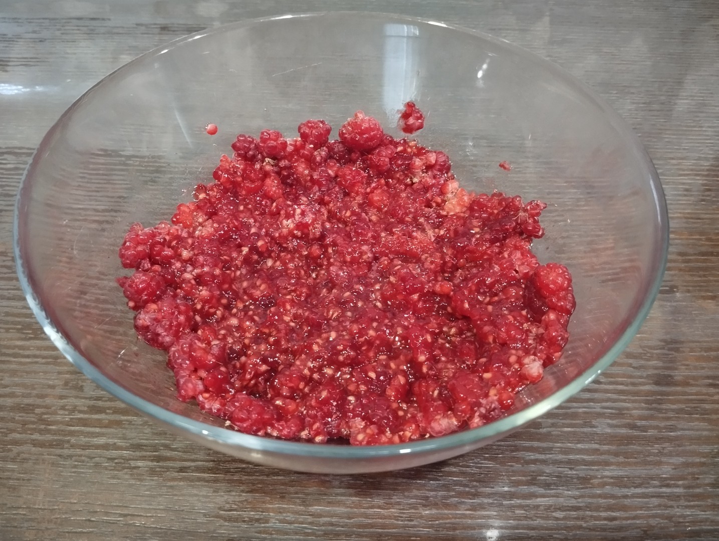 С помощью толкушки для картофеля раздавите малину. Не превращайте её в однородное пюре, лишь подавите слегка.