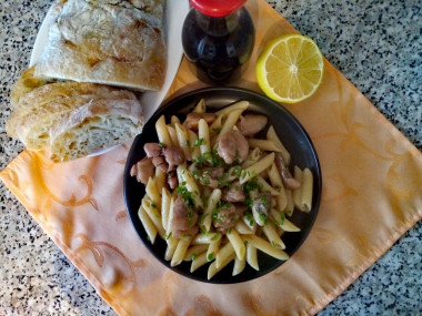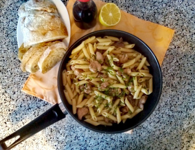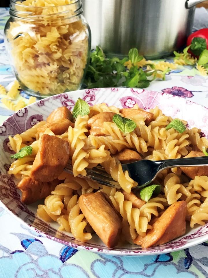 4. Выложите пасту в сковороду к курице, перемешайте и прогрейте около 4 минут.