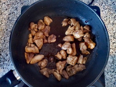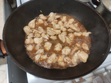 3. Добавите к курице соевый соус, мед, лимонный сок, перемешайте и тушите на медленном огне под крышкой около 15 минут, периодически помешивая.