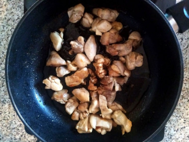 2. Куриное филе помойте, обсушить, нарежьте средними кусочками и обжарьте на оливковом и сливочном маслах около 10 минут.
