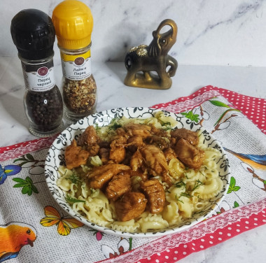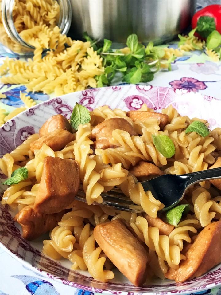 Когда встретила на сайте рецепт: макароны с соевым соусом и курицей, сразу решила попробовать. Заинтересовало сочетание мёда,мяса и соевого соуса. Сын сначала отнёсся скептически к такому рецепту.