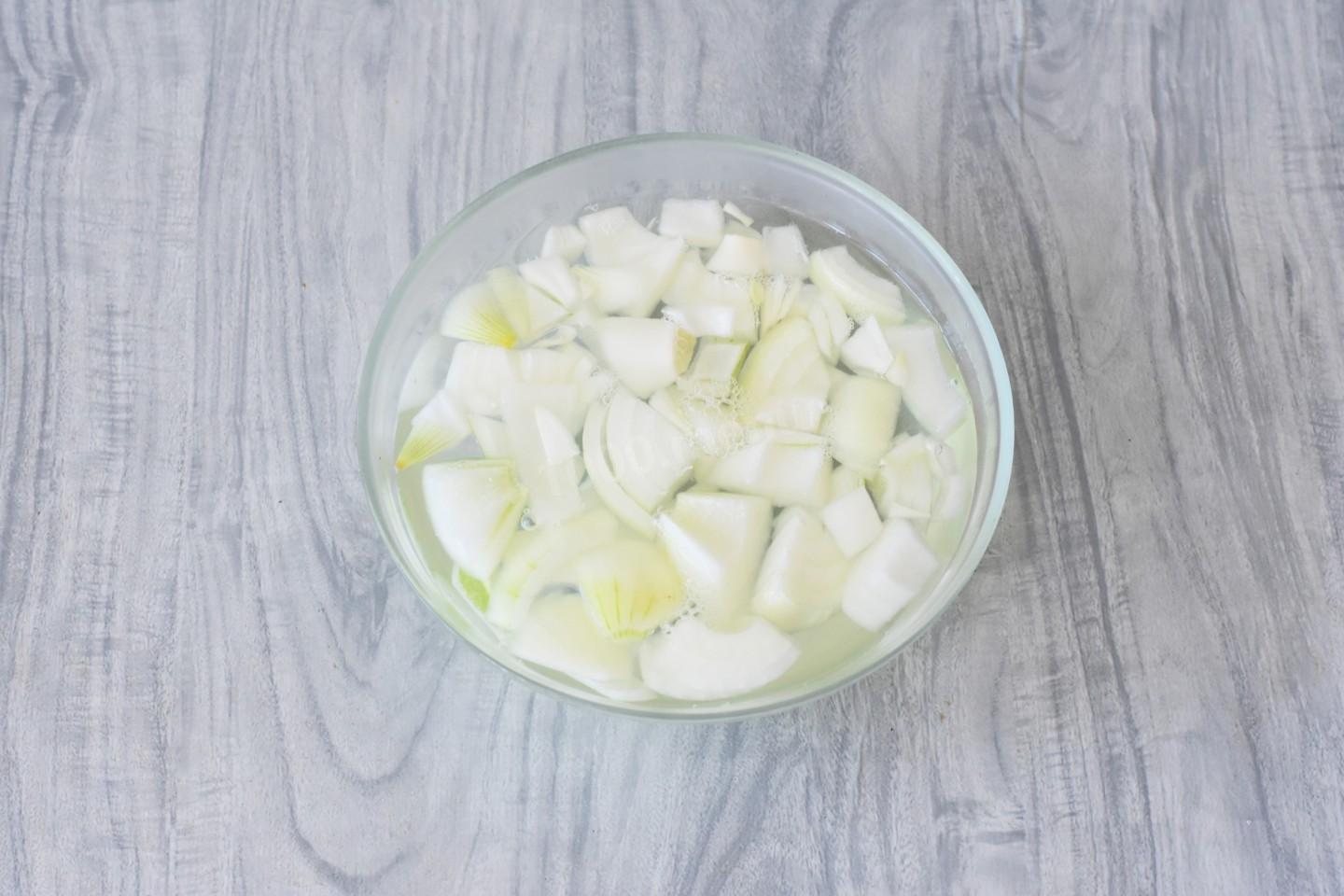 Это необходимо для того, чтобы удалить присущую луку горечь. Очищенный и нарезанный кубиками лук залейте кипятком и оставьте на 5 минут. Затем воду слейте.