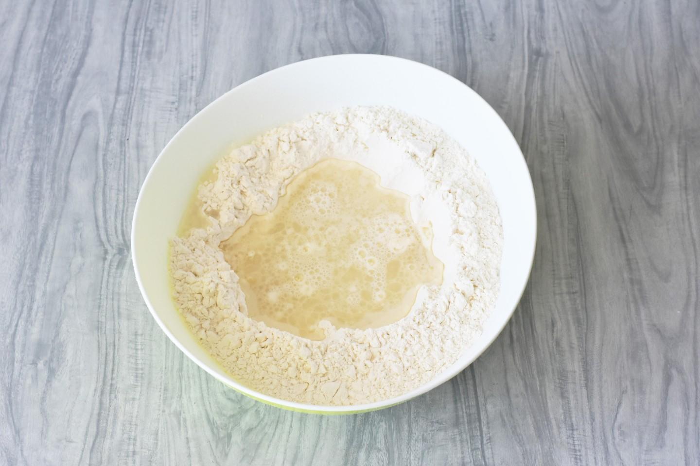 В миску горкой просейте всю муку. Сделайте в ней углубление, влейте горячую воду (примерно 70℃) и масло, всыпьте соль и перемешайте тесто ложкой. Затем продолжите вымешивать тесто руками до однородности. В зависимости от качества муки ее может понадобиться больше или меньше, смотрите на консистенцию теста. Тесто должно получиться мягким и эластичным. Если оно слишком плотное, добавьте еще масла или воды.