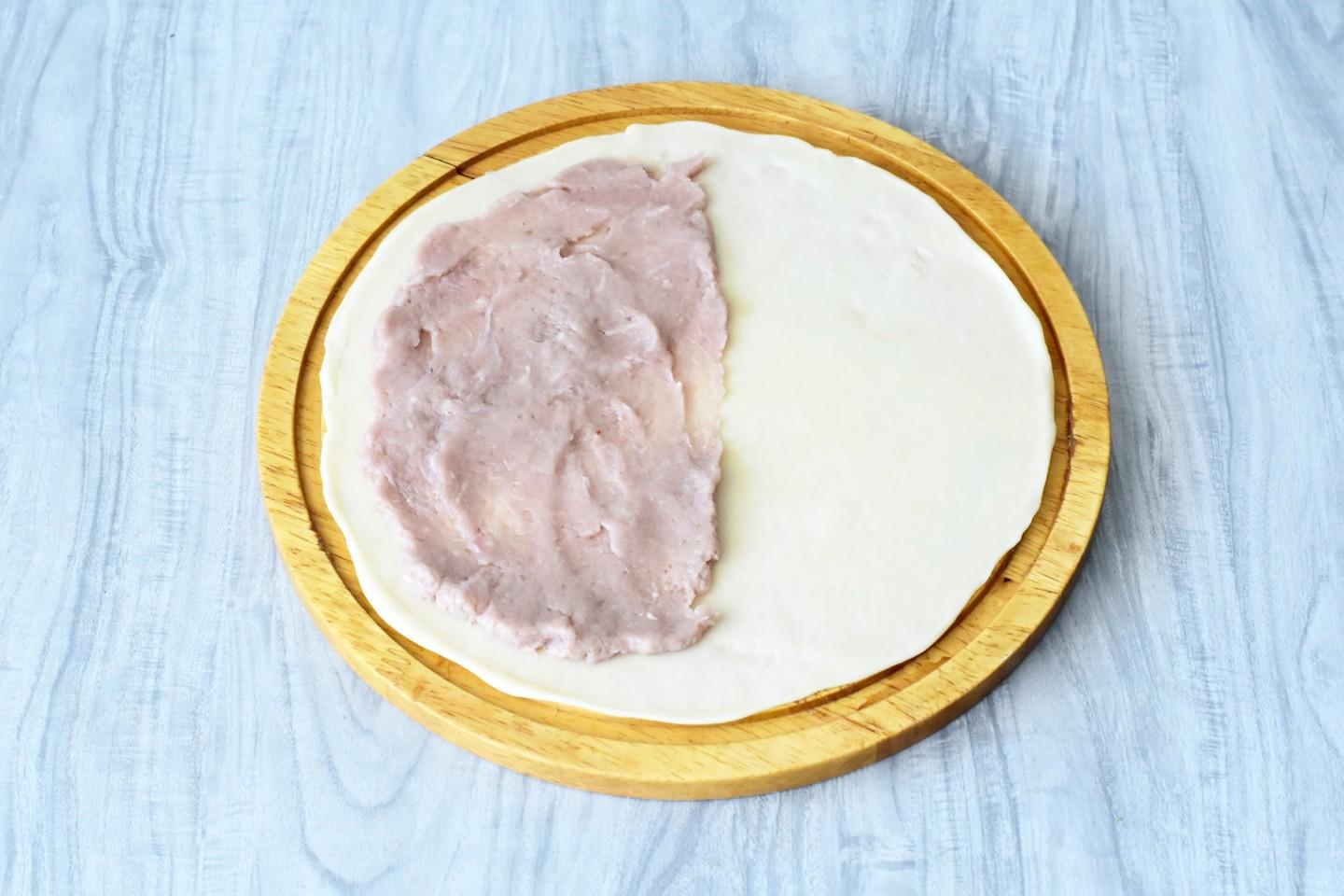 Каждый кусочек теста раскатайте аккуратно скалкой в тонкий ровный круг. При необходимости припылите рабочую поверхность мукой. У меня диаметр одной лепешки примерно 20 см. На нижнюю часть круга выложите 1 ст. л. начинки, не доходя до краев около 1 см.