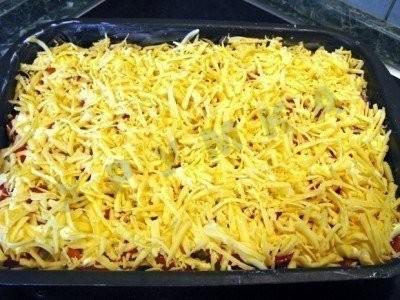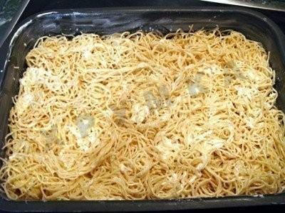 На смазанный противень выложите смешанные с яичной массой спагетти.
