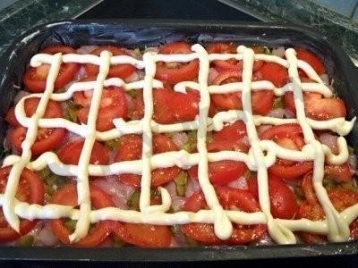 Помидоры порежьте кружочками, уложите на курицу с огурцами, поверх сеткой нанесите майонез.