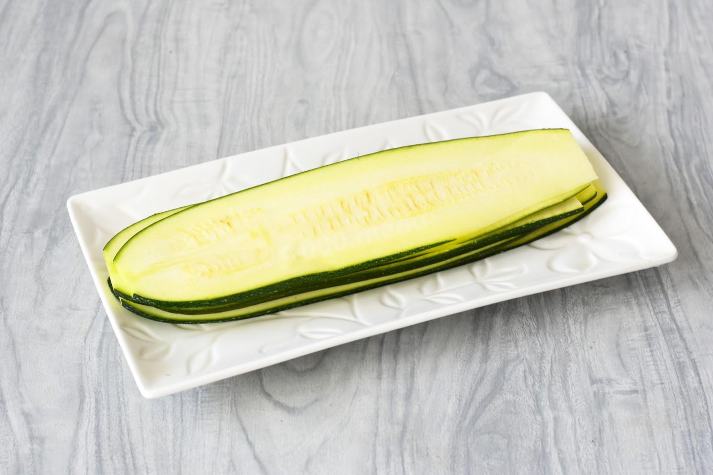 Кабачки вымойте и нарежьте вдоль длинными тонкими лентами. Это можно сделать с помощью слайсера или обычного острого ножа. Кабачки посолите и оставьте на 15 минут. Выделившийся сок слейте. После этого кабачки станут очень эластичными. Обрезки от кабачков мелко порубите ножом или измельчите в блендере.
