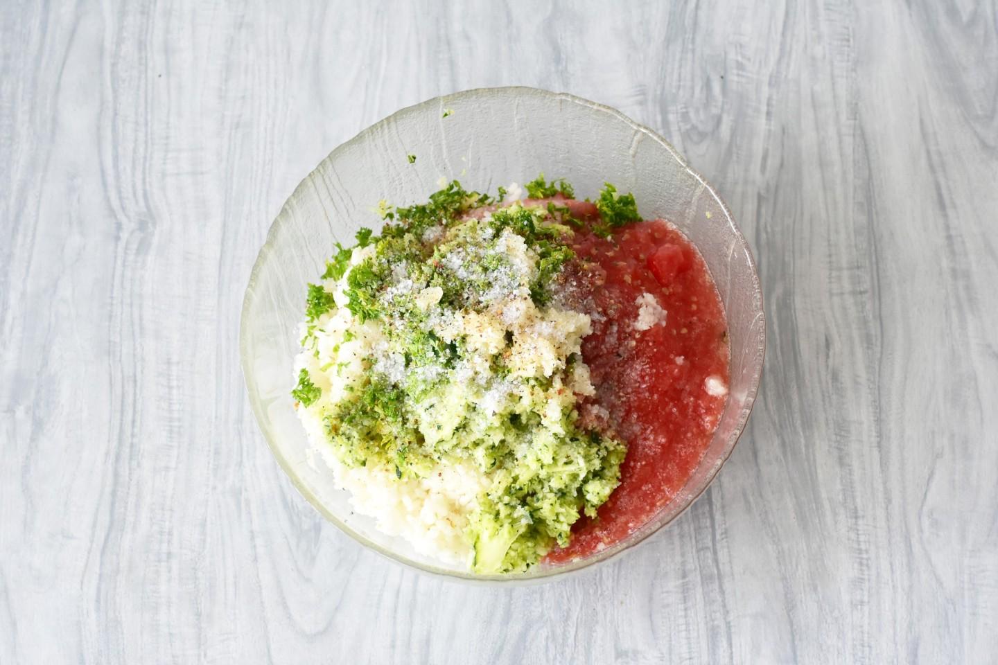 Помидор натрите на крупной терке, отсекая кожицу. Петрушку или другую зелень по вашему вкусу вымойте, обсушите и мелко порубите. В миске соедините фарш, рис, измельченные кабачки, помидор, пропущенные через пресс зубчики чеснока и петрушку. Фарш посолите, поперчите и тщательно перемешайте до однородности.