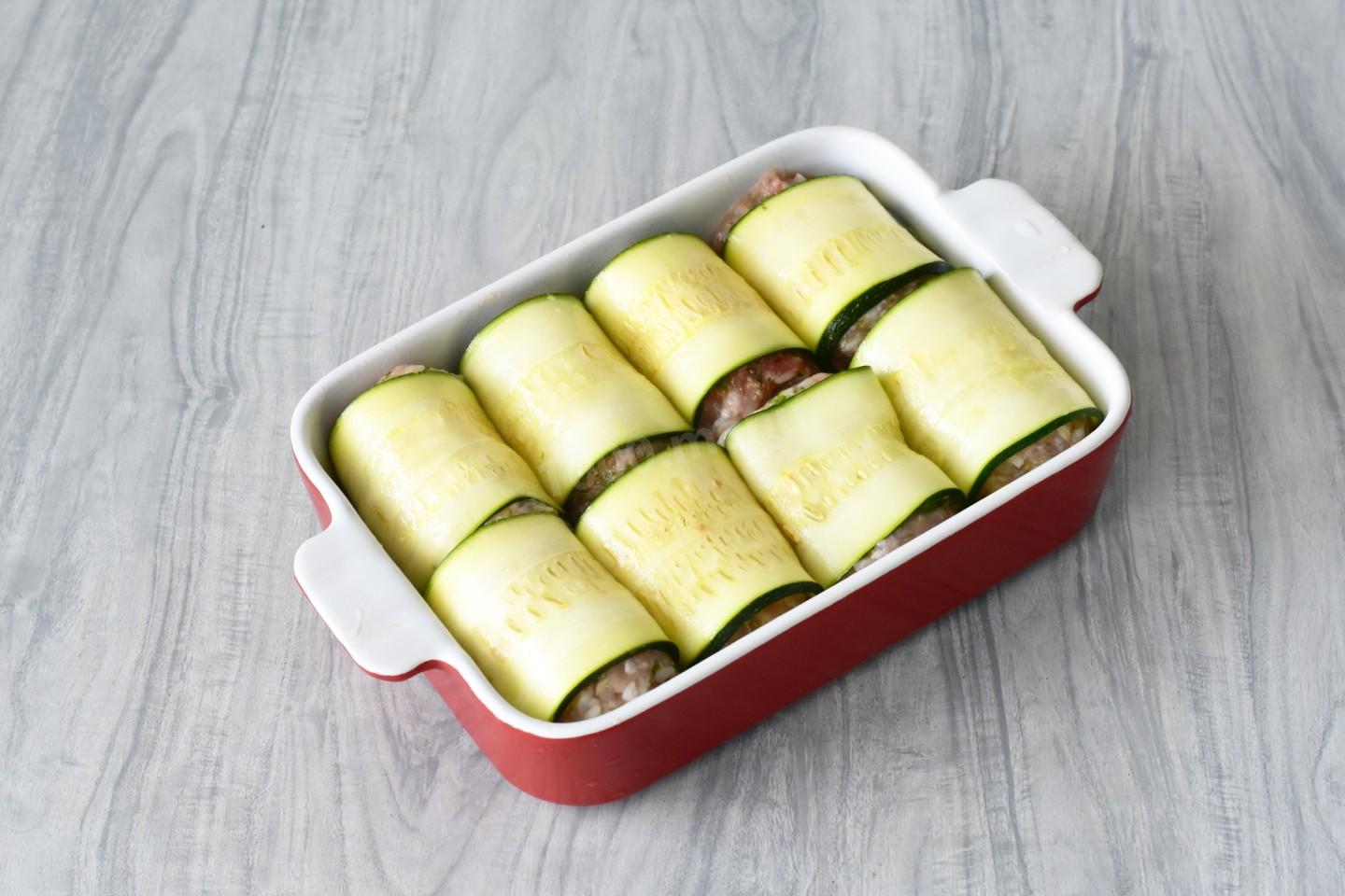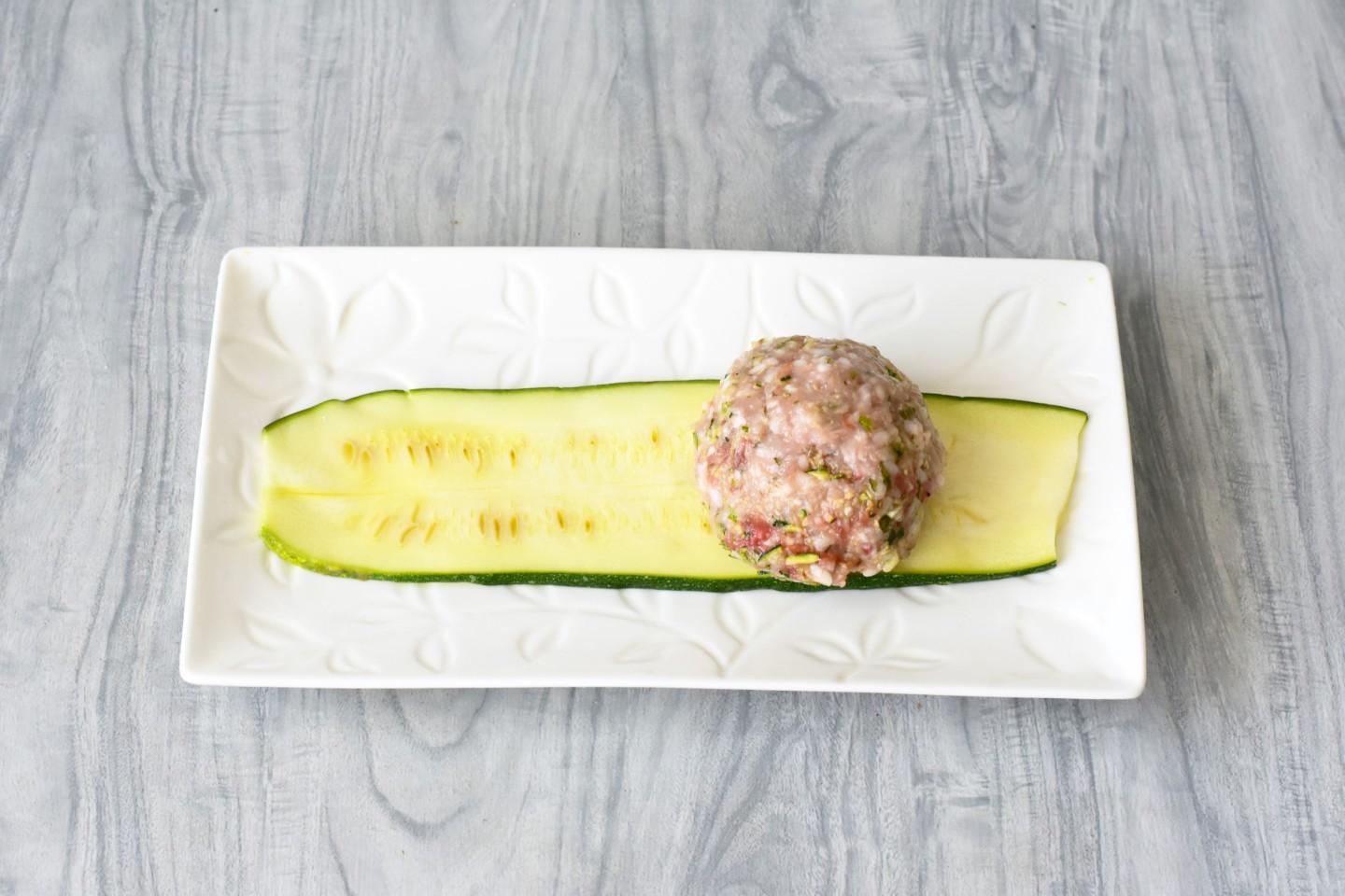 На ломтик кабачка выложите немного фарша. Сверните кабачки рулетиками, чтобы фарш оказался внутри.
