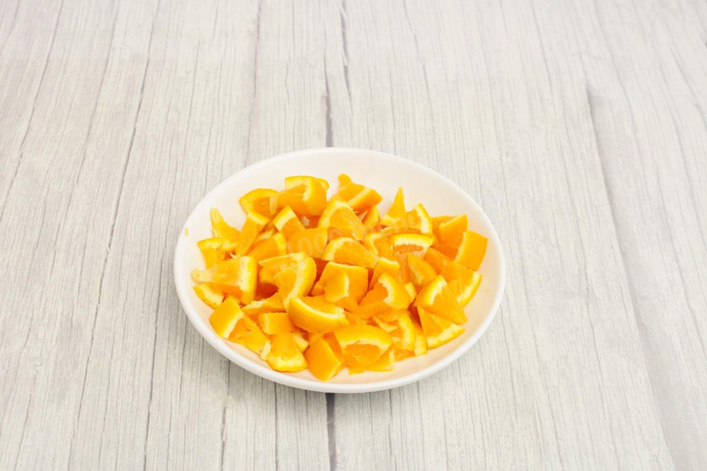 Апельсин помойте, обсушите. Нарежьте фрукт небольшими кусочкам вместе с кожурой, убирая при этом косточки.