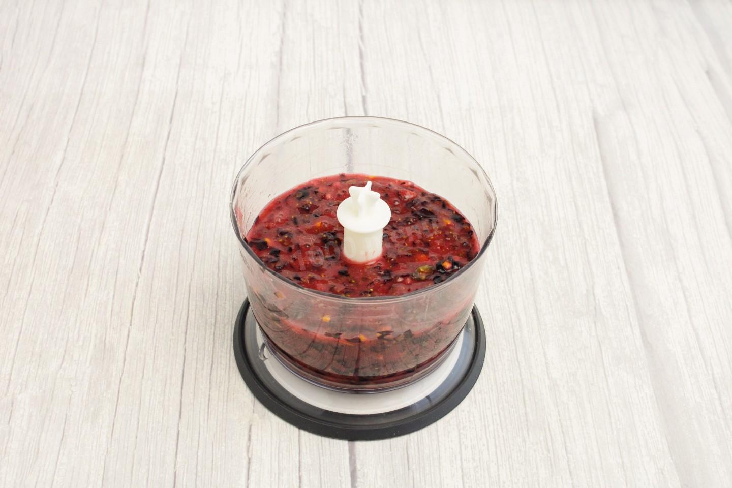 Ягоды с апельсином измельчите в блендере. Можно перекрутить ягоды через мясорубку.